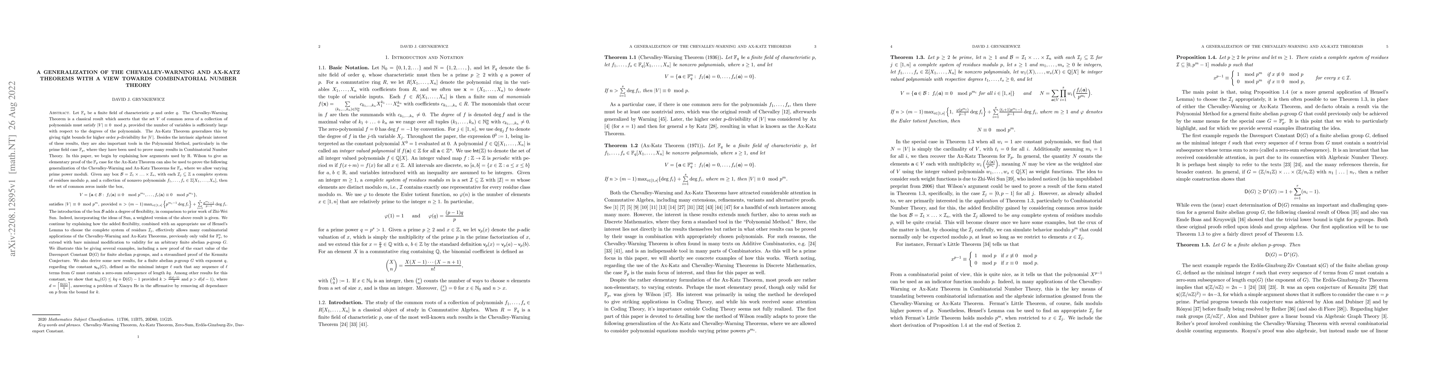 We begin by explaining how arguments used by R. Wilson to give an elementary proof of the $\mathbb F_p$ case for the Ax-Katz Theorem can also be used to prove the following generalization of the Chevalley-Warning and Ax-Katz Theorems for $\mathbb F_p$, where we allow varying prime power moduli. Given any box $\mathcal B=\mathcal I_1\times\ldots\times\mathcal I_n$, with each $\mathcal I_j\subseteq\mathbb Z$ a complete system of residues modulo $p$, and a collection of nonzero polynomials $f_1,\ldots,f_s\in \mathbb Z[X_1,\ldots,X_n]$, then the set of common zeros inside the box, $$V=\{\mathbf a\in \mathcal B:\; f_1(\textbf a)\equiv 0\mod p^{m_1},\ldots,f_s(\textbf a)\equiv 0\mod p^{m_s}\},$$ satisfies $|V|\equiv 0\mod p^m$, provided $n>(m-1)\max_{i\in [1,s]}\Big\{p^{m_i-1}\mathsf{deg} f_i\Big\}+ \sum_{i=1}^{s}\frac{p^{m_i}-1}{p-1}\mathsf{deg} f_i.$ The introduction of the box $\mathcal B$ adds a degree of flexibility, in comparison to prior work of Zhi-Wei Sun. Indeed, incorporating the ideas of Sun, a weighted version of the above result is given. We continue by explaining how the added flexibility, combined with an appropriate use of Hensel's Lemma to choose the complete system of residues $\mathcal I_j$, effectively allows many combinatorial applications of the Chevalley-Warning and Ax-Katz Theorems, previously only valid for $\mathbb F_p^n$, to extend with bare minimal modification to validity for an arbitrary finite abelian $p$-group $G$. We illustrate this be giving several examples, including a new proof of the exact value of the Davenport Constant $\mathsf D(G)$ for finite abelian $p$-groups, a streamlined proof of the Kemnitz Conjecture, and the resolution of a problem of Xiaoyu He regarding zero-sums of length $k\exp(G)$ related to a conjecture of Kubertin.