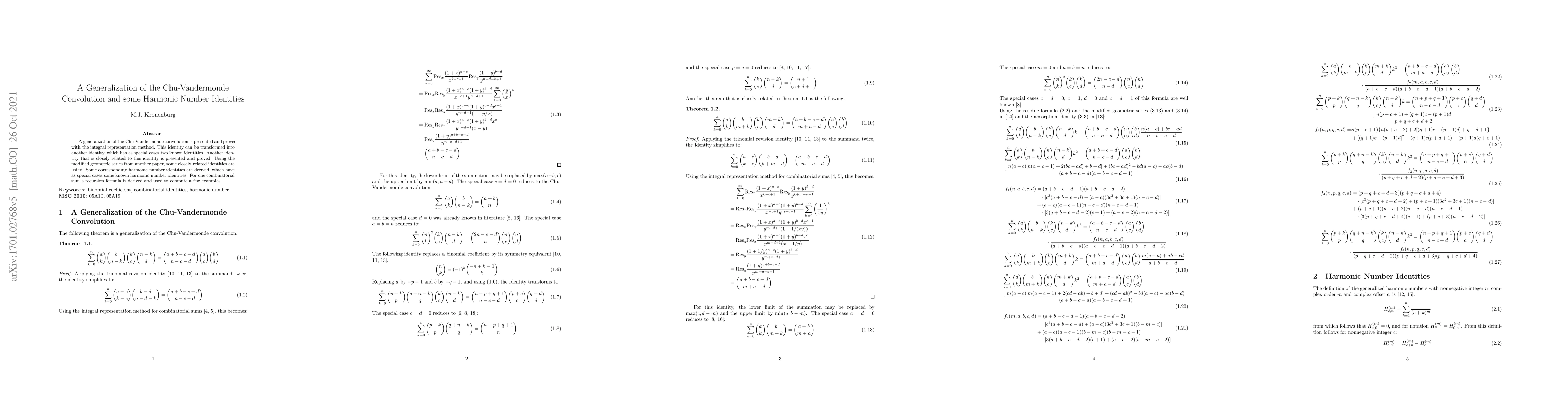 A generalization of the Chu-Vandermonde convolution is presented and proved with the integral representation method. This identity can be transformed into another identity, which has as special cases two known identities. Another identity that is closely related to this identity is presented and proved. Using the modified geometric series from another paper, some closely related identities are listed. Some corresponding harmonic number identities are derived, which have as special cases some known harmonic number identities. For one combinatorial sum a recursion formula is derived and used to compute a few examples.