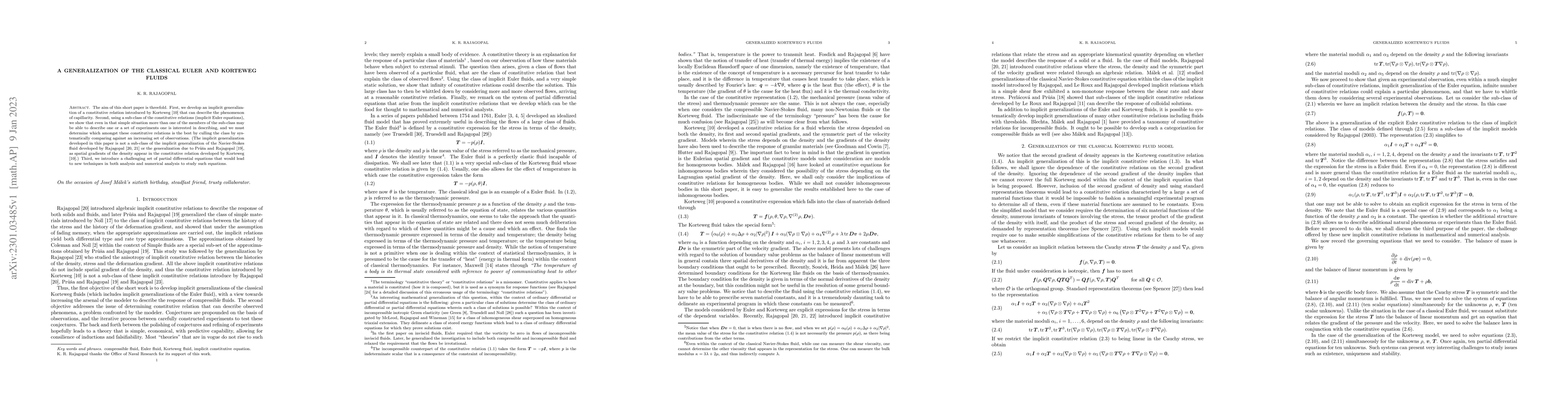 The aim of this short paper is threefold. First, we develop an implicit generalization of a constitutive relation introduced by Korteweg [10] that can describe the phenomenon of capillarity. Second, using a sub-class of the constitutive relations (implicit Euler equations), we show that even in that simple situation more than one of the members of the sub-class may be able to describe one or a set of experiments one is interested in describing, and we must determine which amongst these constitutive relations is the best by culling the class by systematically comparing against an increasing set of observations. (The implicit generalization developed in this paper is not a sub-class of the implicit generalization of the Navier-Stokes fluid developed by Rajagopal [20, 21] or the generalization due to Prusa and Rajagopal [19], as spatial gradients of the density appear in the constitutive relation developed by Korteweg [10].) Third, we introduce a challenging set of partial differential equations that would lead to new techniques in both analysis and numerical analysis to study such equations.
