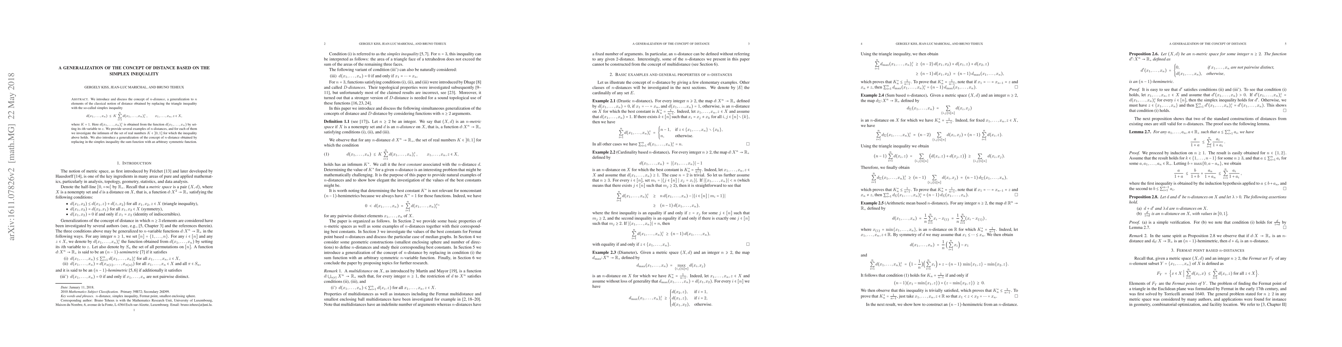 We introduce and discuss the concept of \emph{$n$-distance}, a generalization to $n$ elements of the classical notion of distance obtained by replacing the triangle inequality with the so-called simplex inequality $$ d(x_1, \ldots, x_n)~\leq~K\, \sum_{i=1}^n d(x_1, \ldots, x_n)_i^z{\,}, \qquad x_1, \ldots, x_n, z \in X, $$ where $K=1$. Here $d(x_1,\ldots,x_n)_i^z$ is obtained from the function $d(x_1,\ldots,x_n)$ by setting its $i$th variable to $z$. We provide several examples of $n$-distances, and for each of them we investigate the infimum of the set of real numbers $K\in\left]0,1\right]$ for which the inequality above holds. We also introduce a generalization of the concept of $n$-distance obtained by replacing in the simplex inequality the sum function with an arbitrary symmetric function.