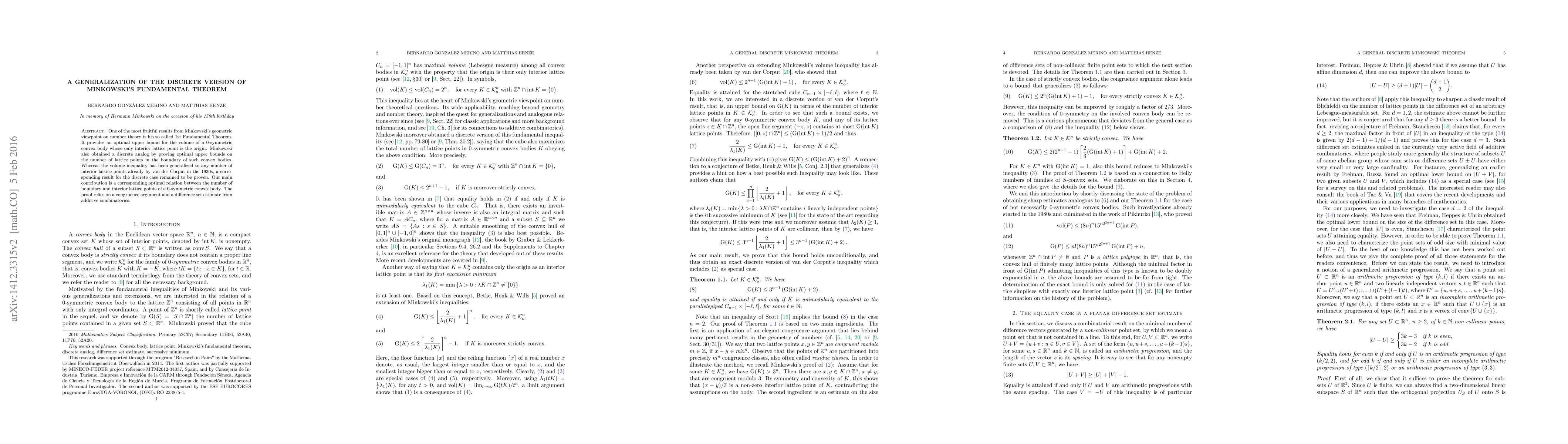 This paper presents a generalization of Minkowski's discrete theorem, providing an optimal relationship between the number of boundary and interior lattice points of a symmetric convex body with only the origin as its interior lattice point. The proof uses congruence arguments and difference set estimates from additive combinatorics.
