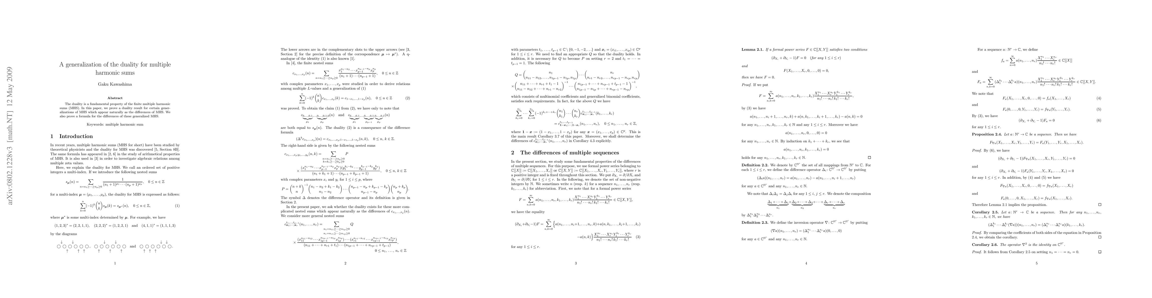 The duality is a fundamental property of the finite multiple harmonic sums (MHS). In this paper, we prove a duality result for certain generalizations of MHS which appear naturally as the differences of MHS. We also prove a formula for the differences of these generalized MHS.