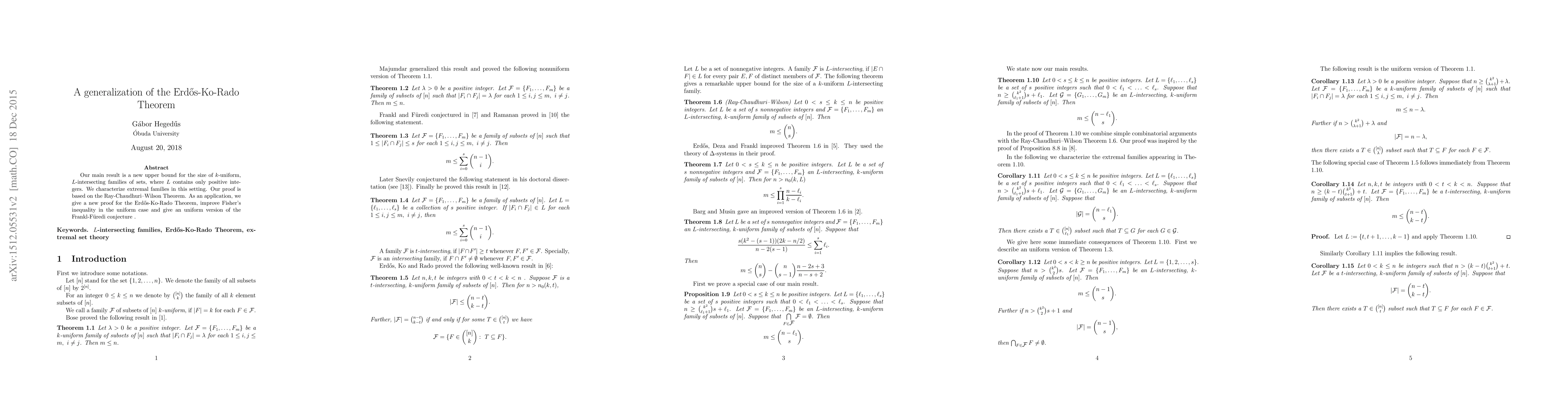 This paper presents a new upper bound for k-uniform, L-intersecting families of sets, characterized by extremal families, using the Ray-Chaudhuri-Wilson Theorem. It also provides a new proof for the Erdős-Ko-Rado Theorem, improves Fisher's inequality in the uniform case, and offers an uniform version of the Frankl-Füredi conjecture.