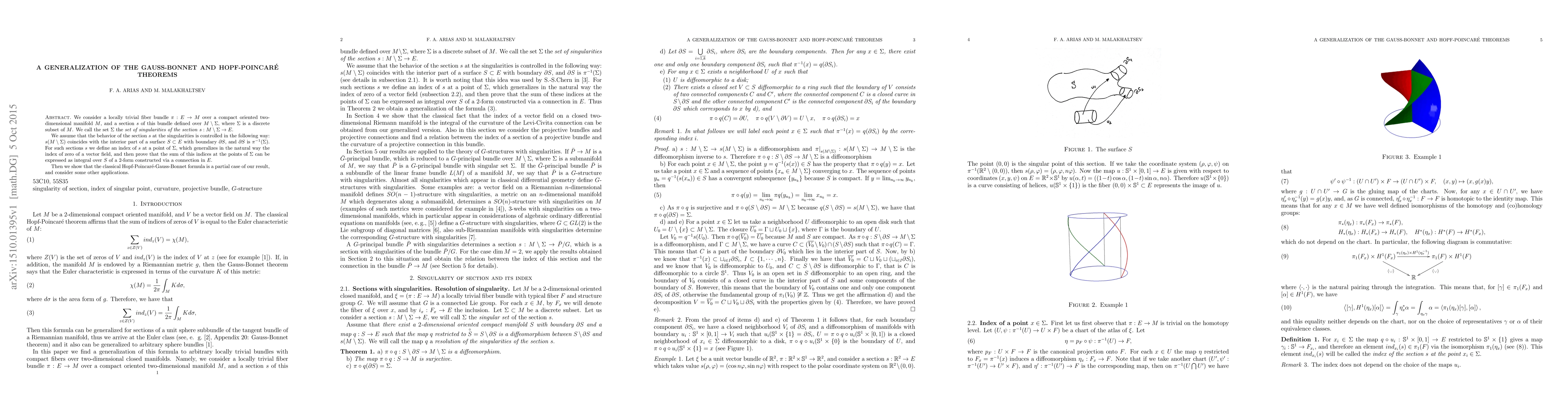 This paper generalizes the Gauss-Bonnet and Hopf-Poincaré theorems by extending the classical results to sections of fiber bundles over compact oriented two-dimensional manifolds, incorporating singularities and defining an index for these points. The sum of indices at singularities is shown to relate to an integral over a surface defined via a connection in the bundle.