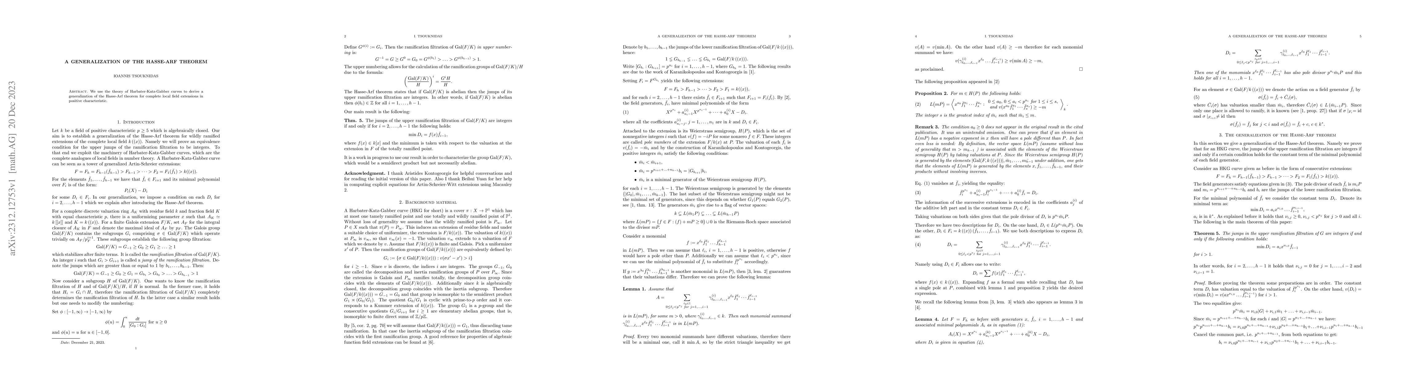 Summary: This paper generalizes the Hasse-Arf theorem using the theory of Harbater-Katz-Gabber curves, focusing on complete local field extensions in positive characteristic. The new generalization extends the applicability of the theorem in this context.