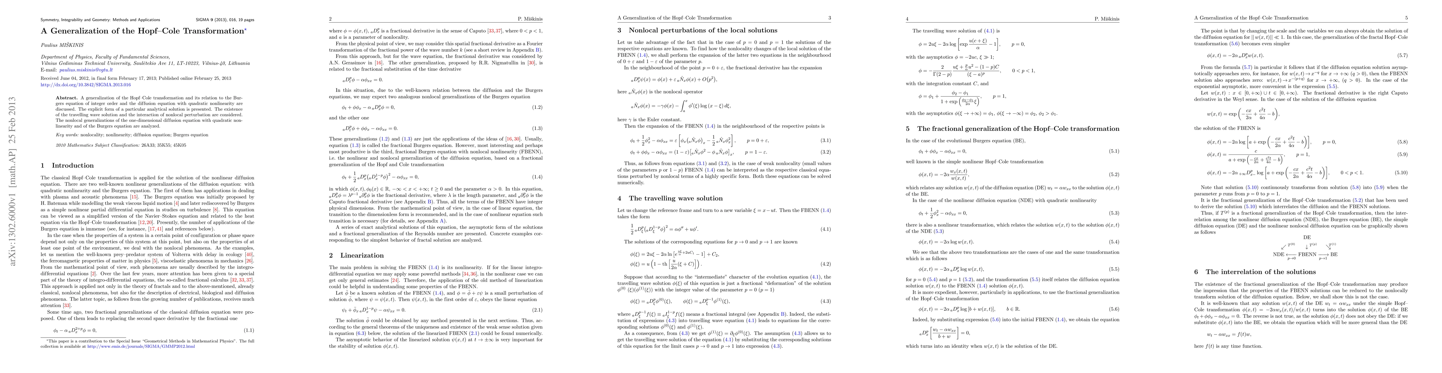 This paper generalizes the Hopf-Cole transformation, linking it to the Burgers equation and the diffusion equation with quadratic nonlinearity, presenting an explicit analytical solution and exploring the existence of travelling wave solutions and nonlocal perturbations. The nonlocal versions of the one-dimensional diffusion equation and Burgers equation are also analyzed.