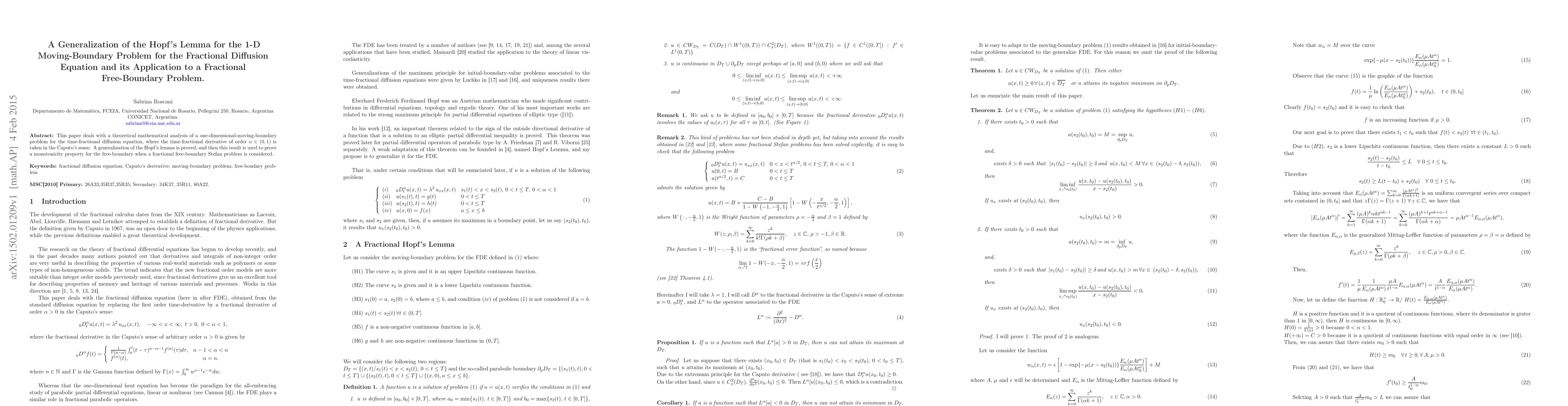 Researchers generalized Hopf's lemma for a 1-D moving-boundary problem involving fractional diffusion equations, proving a monotonicity property for a fractional free-boundary Stefan problem.