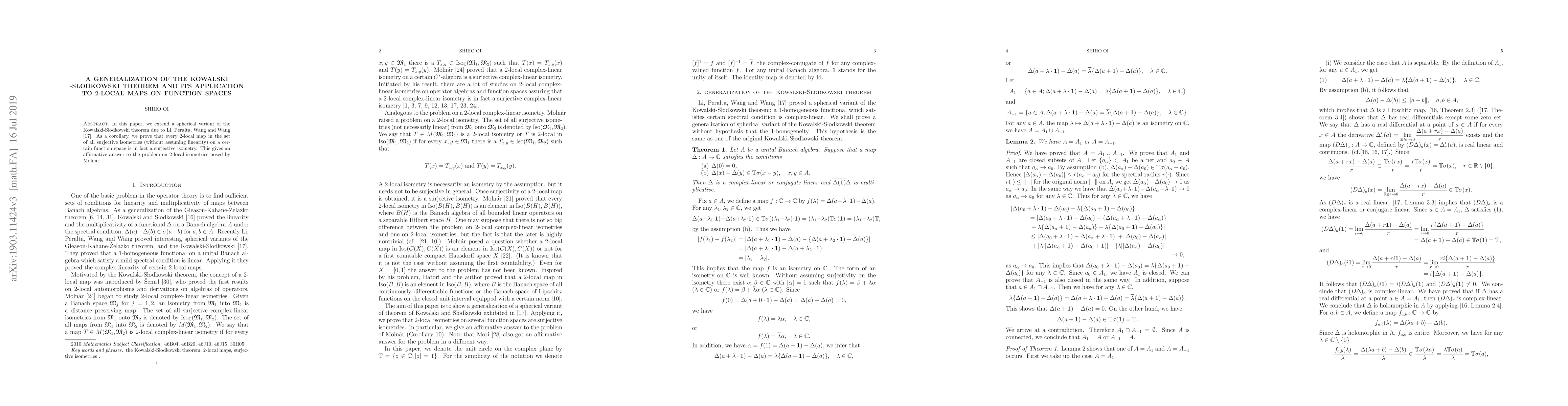 In this paper, we extend a spherical variant of the Kowalski-S\{l}odkowski theorem due to Li, Peralta, Wang and Wang. As a corollary, we prove that every 2-local map in the set of all surjective isometries (without assuming linearity) on a certain function space is in fact a surjective isometry. This gives an affirmative answer to the problem on 2-local isometries posed by Moln\'ar.