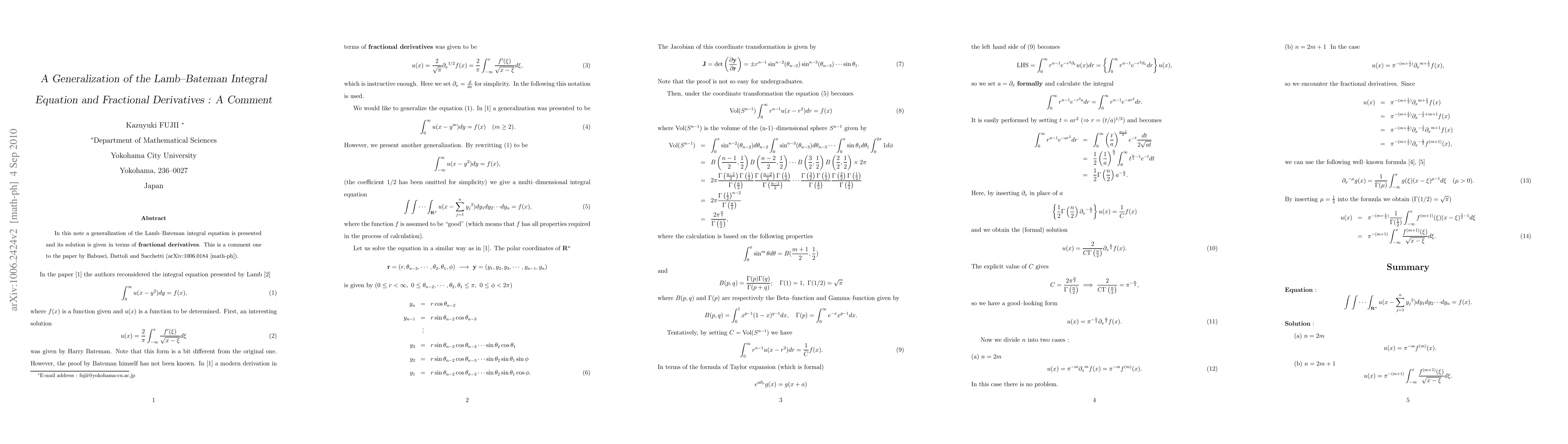 In this note a generalization of the Lamb-Bateman integral equation is presented and its solution is given in terms of {\bf fractional derivatives}. This is a comment one to the paper by Babusci, Dattoli and Sacchetti (arXiv:1006.0184 [math-ph]).