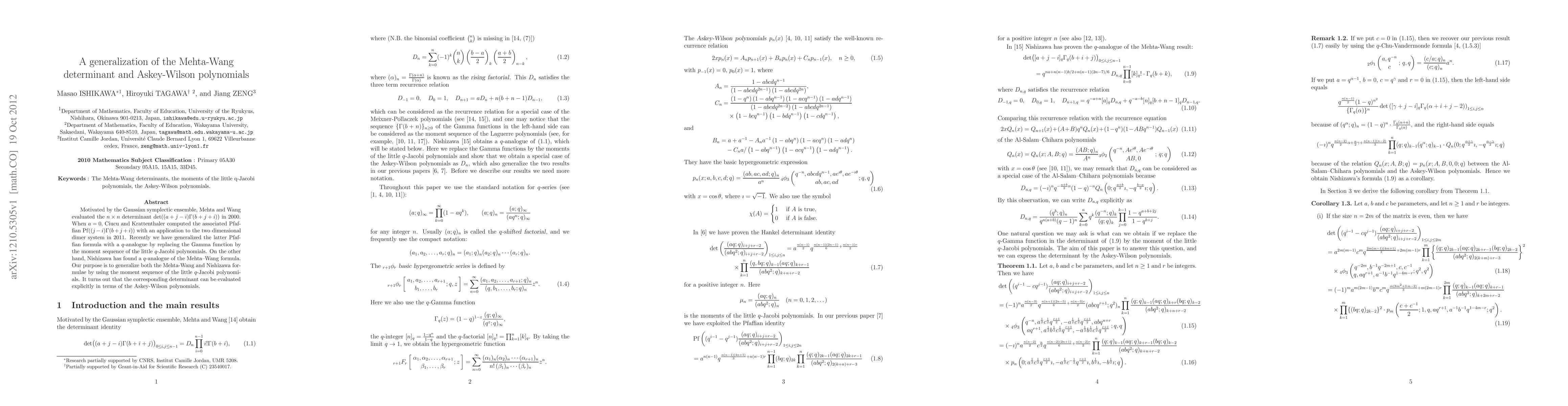 Motivated by the Gaussian symplectic ensemble, Mehta and Wang evaluated the $n$ by $n$ determinant $\det((a+j-i)\Gamma(b+j+i))$ in 2000. When $a=0$, Ciucu and Krattenthaler computed the associated Pfaffian $\Pf((j-i)\Gamma(b+j+i))$ with an application to the two dimensional dimer system in 2011. Recently we have generalized the latter Pfaffian formula with a $q$-analogue by replacing the Gamma function by the moment sequence of the little $q$-Jacobi polynomials. On the other hand, Nishizawa has found a $q$-analogue of the Mehta--Wang formula. Our purpose is to generalize both the Mehta-Wang and Nishizawa formulae by using the moment sequence of the little $q$-Jacobi polynomials. It turns out that the corresponding determinant can be evaluated explicitly in terms of the Askey-Wilson polynomials.