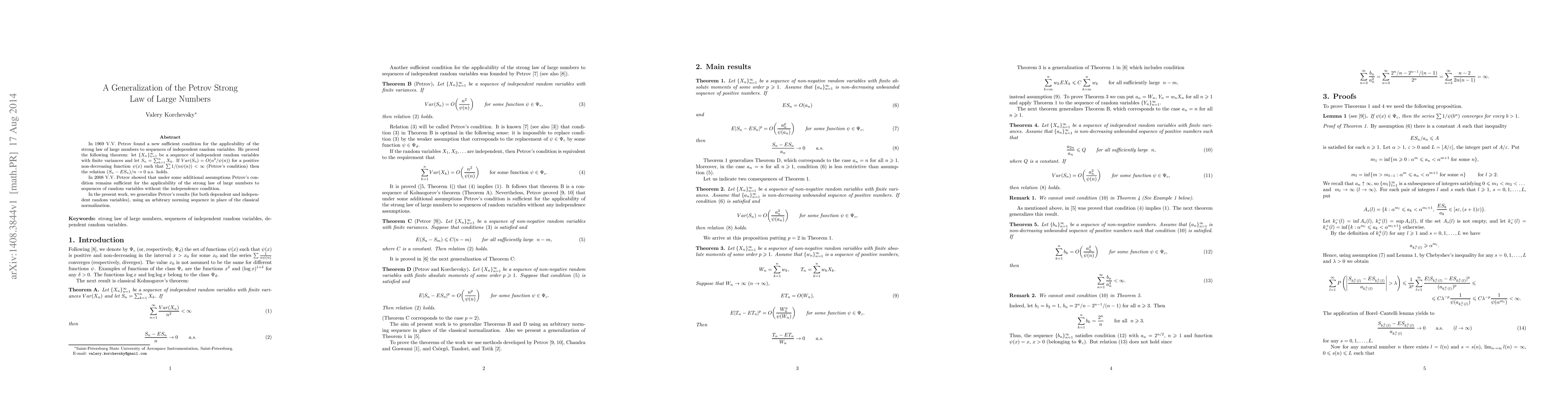 In 1969 V.V.~Petrov found a new sufficient condition for the applicability of the strong law of large numbers to sequences of independent random variables. He proved the following theorem: let $\{X_{n}\}_{n=1}^{\infty}$ be a sequence of independent random variables with finite variances and let $S_{n}=\sum_{k=1}^{n} X_{k}$. If $Var (S_{n})=O (n^{2}/\psi(n))$ for a positive non-decreasing function $\psi(x)$ such that $\sum 1/(n \psi(n)) < \infty$ (Petrov's condition) then the relation $(S_{n}-ES_{n})/n \to 0$ a.s. holds. In 2008 V.V.~Petrov showed that under some additional assumptions Petrov's condition remains sufficient for the applicability of the strong law of large numbers to sequences of random variables without the independence condition. In the present work, we generalize Petrov's results (for both dependent and independent random variables), using an arbitrary norming sequence in place of the classical normalization.
