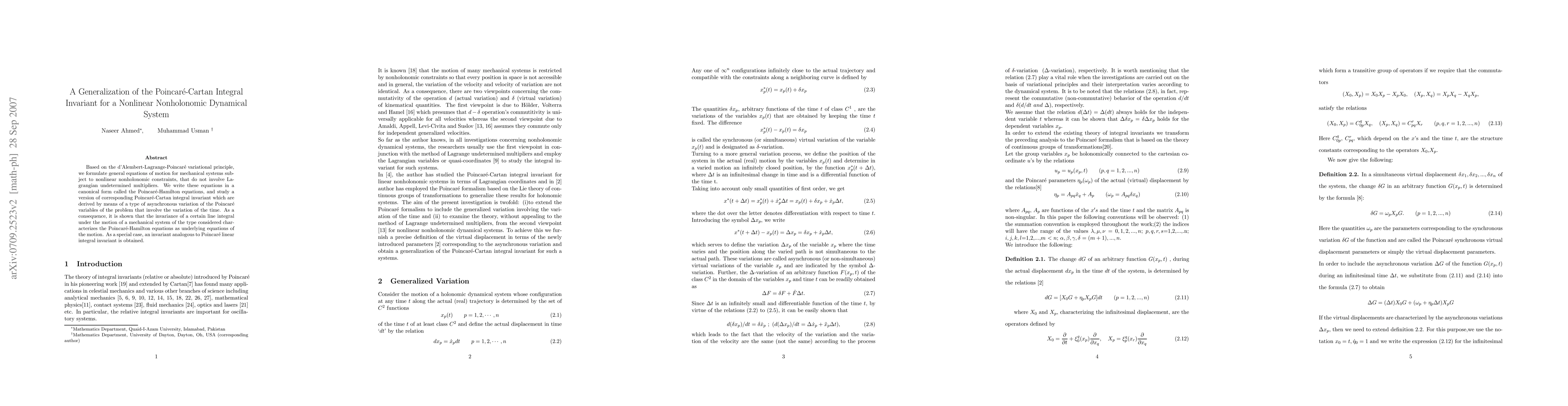 Based on the d'Alembert-Lagrange-Poincar\'{e} variational principle, we formulate general equations of motion for mechanical systems subject to nonlinear nonholonomic constraints, that do not involve Lagrangian undetermined multipliers. We write these equations in a canonical form called the Poincar\'{e}-Hamilton equations, and study a version of corresponding Poincar\'{e}-Cartan integral invariant which are derived by means of a type of asynchronous variation of the Poincar\'{e} variables of the problem that involve the variation of the time. As a consequence, it is shown that the invariance of a certain line integral under the motion of a mechanical system of the type considered characterizes the Poincar\'{e}-Hamilton equations as underlying equations of the motion. As a special case, an invariant analogous to Poincar\'{e} linear integral invariant is obtained.