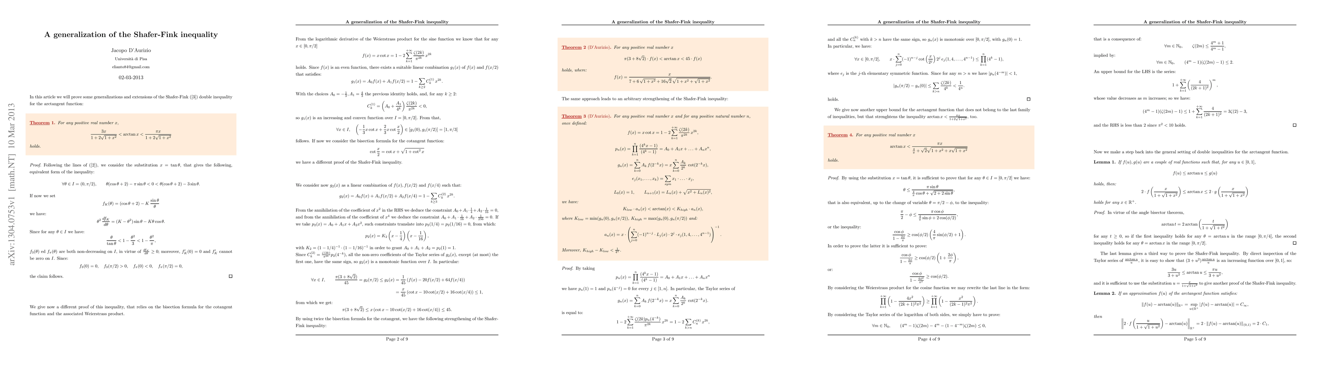 In this article we show a tecnique based on the Weierstrass product for the sine and cosine function and the bisection formula for the cotangent function that leads to a generalization of the classical Shafer-Fink inequality $ \frac{3 x}{1+2\sqrt{1+x^2}} < \arctan x < \frac{\pi x}{1+2\sqrt{1+x^2}}$. Other algebraic approximations are also shown, including one that follows from the Chebyshev expansion for the arctangent function in the interval $[-1,1]$.