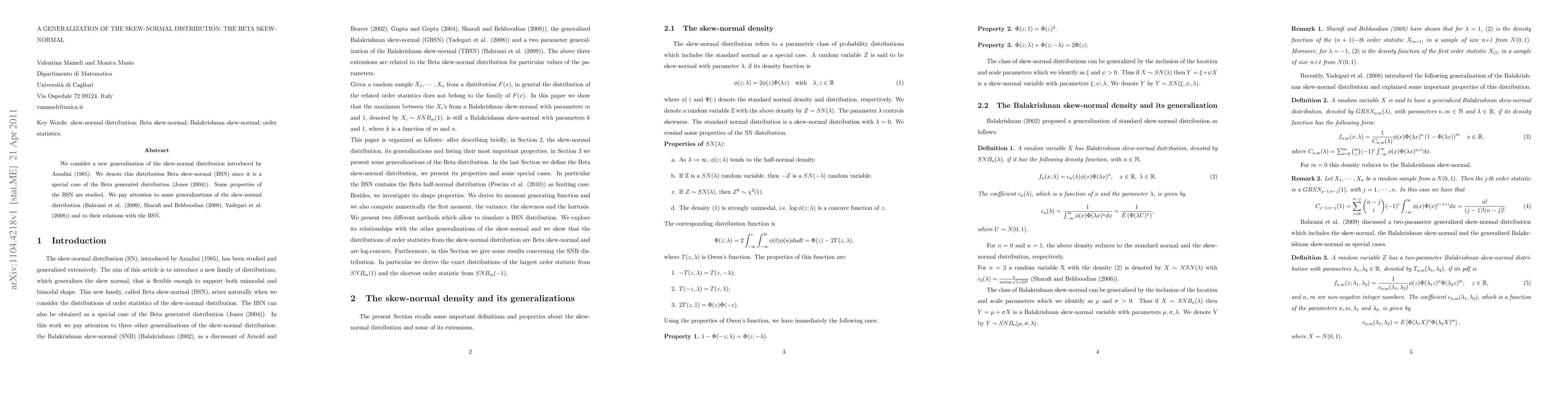 This paper introduces the Beta skew-normal (BSN) distribution, a generalization of the skew-normal distribution arising from order statistics. It explores related generalizations like the Balakrishnan skew-normal and its variants, and discusses properties, moments, and simulation methods for the BSN.