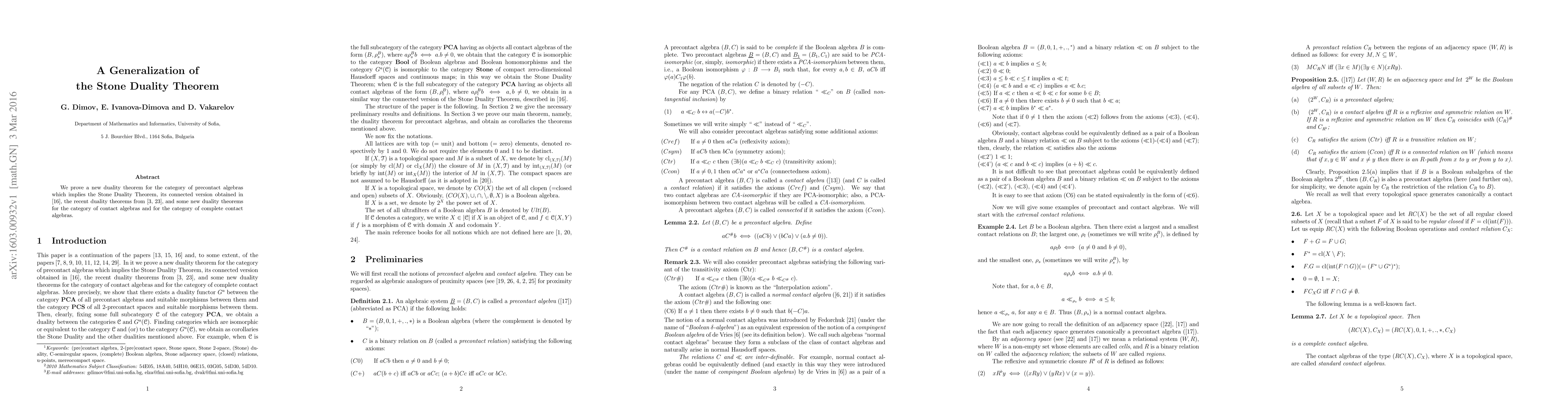 This paper establishes a generalized duality theorem for precontact algebras, encompassing the Stone Duality Theorem, its connected version, and recent duality results for contact and complete contact algebras, extending existing topological and algebraic dualities.