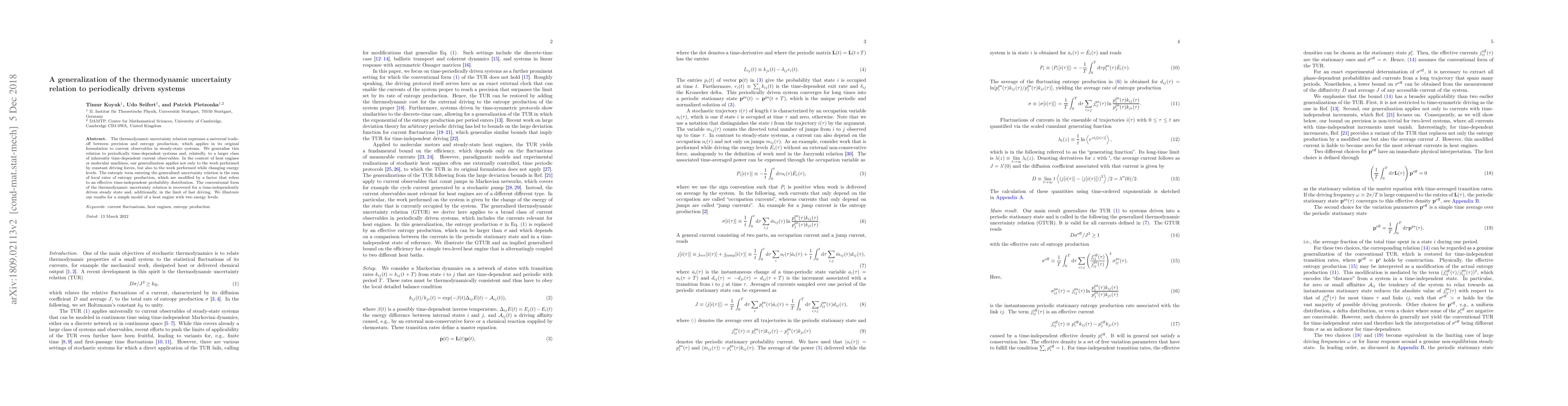 This paper generalizes the thermodynamic uncertainty relation to periodically driven systems, extending its application to time-dependent current observables and variable energy levels in heat engines. The new relation retains the conventional form under steady-state conditions and fast driving.