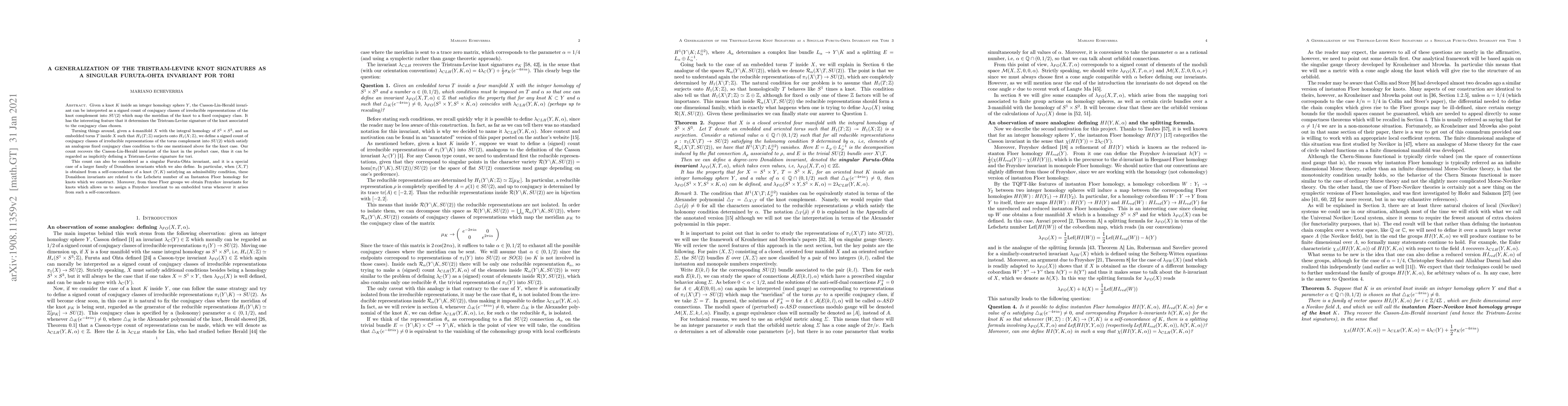 Given a knot $K$ inside an integer homology sphere $Y$, the Casson-Lin-Herald invariant can be interpreted as a signed count of conjugacy classes of irreducible representations of the knot complement into $SU(2)$ which map the meridian of the knot to a fixed conjugacy class. It has the interesting feature that it determines the Tristram-Levine signature of the knot associated to the conjugacy class chosen. Turning things around, given a 4-manifold $X$ with the integral homology of $S^{1}\times S^{3}$, and an embedded torus $T$ inside $X$ such that $H_{1}(T;\mathbb{Z})$ surjects onto $H_{1}(X;\mathbb{Z})$, we define a signed count of conjugacy classes of irreducible representations of the torus complement into $SU(2)$ which satisfy an analogous fixed conjugacy class condition to the one mentioned above for the knot case. Our count recovers the Casson-Lin-Herald invariant of the knot in the product case, thus it can be regarded as implicitly defining a Tristram-Levine signature for tori. This count can also be considered as a singular Furuta-Ohta invariant, and it is a special case of a larger family of Donaldson invariants which we also define. In particular, when $(X,T)$ is obtained from a self-concordance of a knot $(Y,K)$ satisfying an admissibility condition, these Donaldson invariants are related to the Lefschetz number of an Instanton Floer homology for knots which we construct. Moreover, from these Floer groups we obtain Fr{\o}yshov invariants for knots which allows us to assign a Fr{\o}yshov invariant to an embedded torus whenever it arises from such a self-concordance.