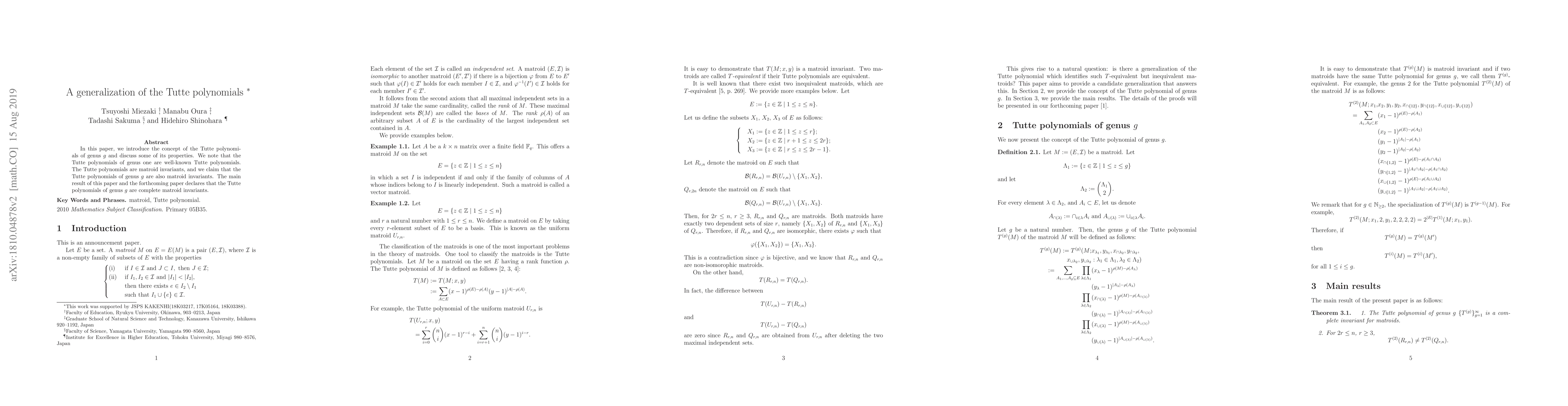 This paper introduces Tutte polynomials of genus $g$ and demonstrates their properties, noting that genus one corresponds to the well-known Tutte polynomials. It concludes that these generalized polynomials are complete matroid invariants.