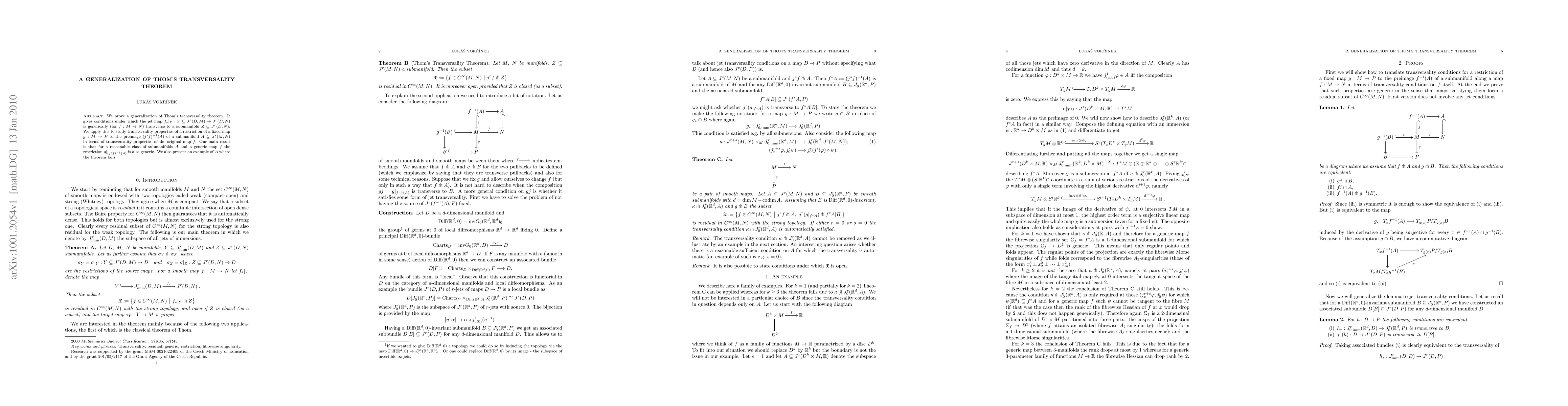 This paper generalizes Thom's transversality theorem to jet maps, establishing conditions under which the jet map is generically transverse to a submanifold. The generalization is applied to show that for a generic map and suitable submanifolds, the transversality properties of a restricted map are preserved.
