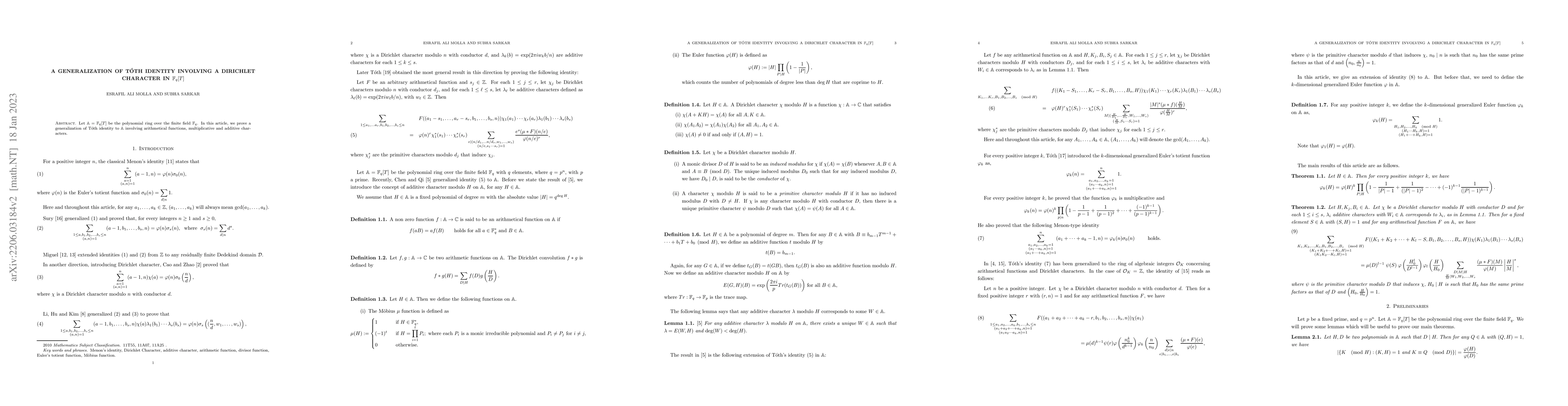 Summary: This paper generalizes Tóth's identity in the polynomial ring over a finite field $\mathbb{F}_q$ by incorporating arithmetic functions and Dirichlet characters. The result highlights the interplay between multiplicative and additive characters within this algebraic structure.