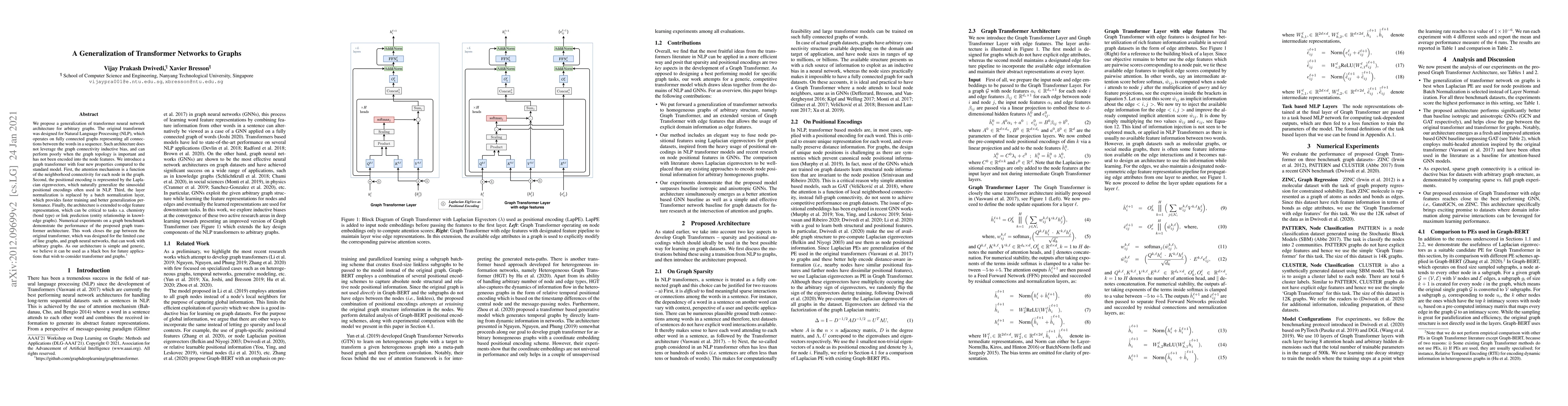We propose a generalization of transformer neural network architecture for arbitrary graphs. The original transformer was designed for Natural Language Processing (NLP), which operates on fully connected graphs representing all connections between the words in a sequence. Such architecture does not leverage the graph connectivity inductive bias, and can perform poorly when the graph topology is important and has not been encoded into the node features. We introduce a graph transformer with four new properties compared to the standard model. First, the attention mechanism is a function of the neighborhood connectivity for each node in the graph. Second, the positional encoding is represented by the Laplacian eigenvectors, which naturally generalize the sinusoidal positional encodings often used in NLP. Third, the layer normalization is replaced by a batch normalization layer, which provides faster training and better generalization performance. Finally, the architecture is extended to edge feature representation, which can be critical to tasks s.a. chemistry (bond type) or link prediction (entity relationship in knowledge graphs). Numerical experiments on a graph benchmark demonstrate the performance of the proposed graph transformer architecture. This work closes the gap between the original transformer, which was designed for the limited case of line graphs, and graph neural networks, that can work with arbitrary graphs. As our architecture is simple and generic, we believe it can be used as a black box for future applications that wish to consider transformer and graphs.