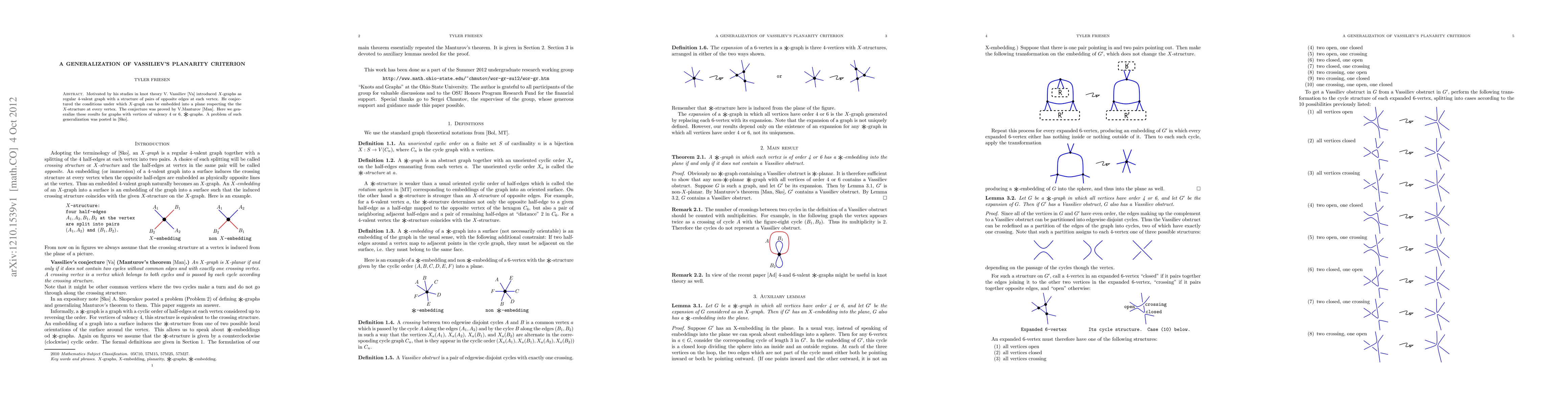 Motivated by his studies in knot theory V. Vassiliev introduced $X$-graphs as regular 4-valent graph with a structure of pairs of opposite edges at each vertex. He conjectured the conditions under which $X$-graph can be embedded into a plane respecting the the $X$-structure at every vertex. The conjecture was proved by V.Manturov. Here we generalize these results for graphs with vertices of valency 4 or 6, *-graphs. A problem of such generalization was posted by A.Skopenkov.
