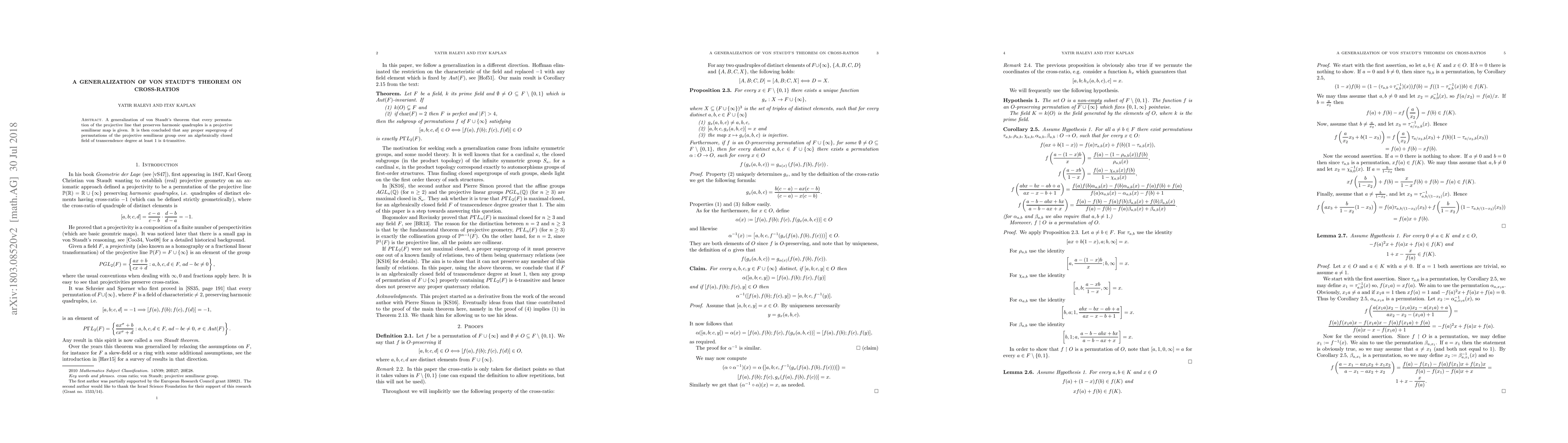 A generalization of von Staudt's theorem that every permutation of the projective line that preserves harmonic quadruples is a projective semilinear map is given. It is then concluded that any proper supergroup of permutations of the projective semilinear group over an algebraically closed field of transcendence degree at least 1 is 4-transitive.