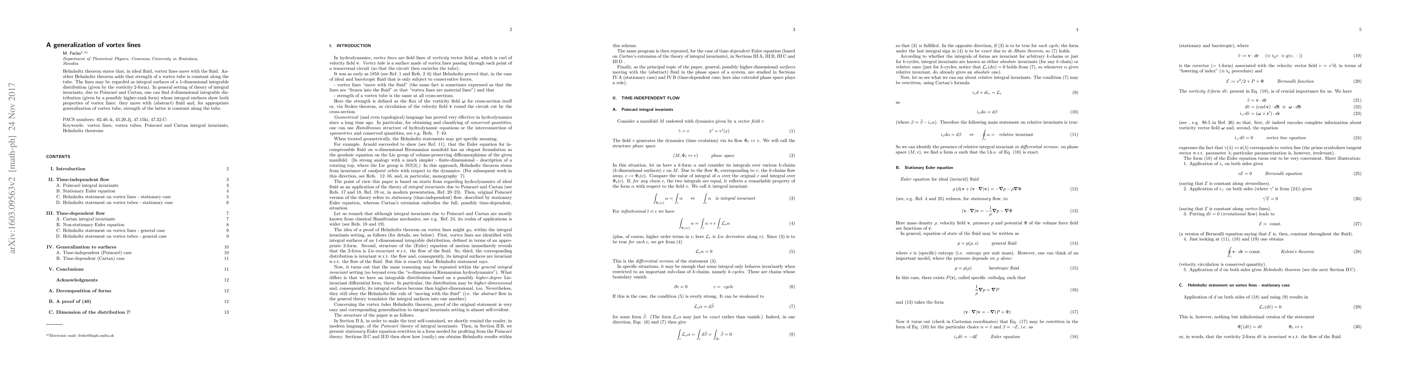 Helmholtz theorem states that, in ideal fluid, vortex lines move with the fluid. Another Helmholtz theorem adds that strength of a vortex tube is constant along the tube. The lines may be regarded as integral surfaces of a 1-dimensional integrable distribution (given by the vorticity 2-form). In general setting of theory of integral invariants, due to Poincare and Cartan, one can find $d$-dimensional integrable distribution whose integral surfaces show both properties of vortex lines: they move with (abstract) fluid and, for appropriate generalization of vortex tube, strength of the latter is constant along the tube.