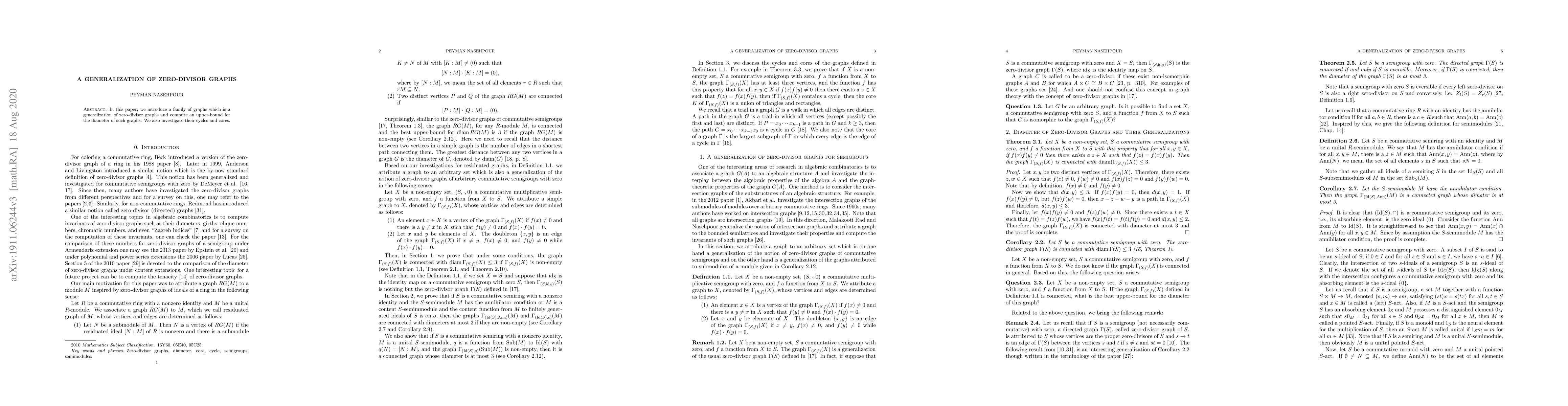 In this paper, we introduce a family of graphs which is a generalization of zero-divisor graphs and compute an upper-bound for the diameter of such graphs. We also investigate their cycles and cores.