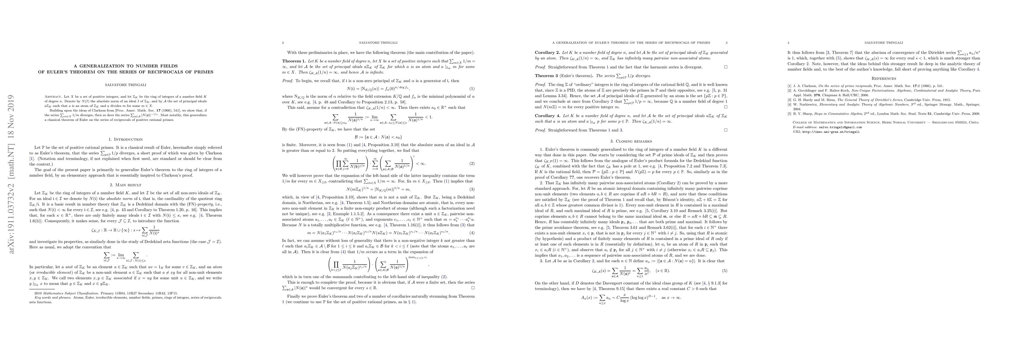 Let $X$ be a set of positive integers, and let $\mathbb Z_K$ be the ring of integers of a number field $K$ of degree $n$. Denote by $N(I)$ the absolute norm of an ideal $I$ of $\mathbb Z_K$, and by $\mathcal A$ the set of principal ideals $a\mathbb Z_K$ such that $a$ is an atom of $\mathbb Z_K$ and $a$ divides $m$ for some $m \in X$. Building upon the ideas of Clarkson from [Proc. Amer. Math. Soc. 17 (1966), 541], we show that, if the series $\sum_{m \in X} 1/m$ diverges, then so does the series $\sum_{\mathfrak a \in \mathcal A} |N(\mathfrak a)|^{-1/n}$. Most notably, this generalizes a classical theorem of Euler on the series of reciprocals of positive rational primes.