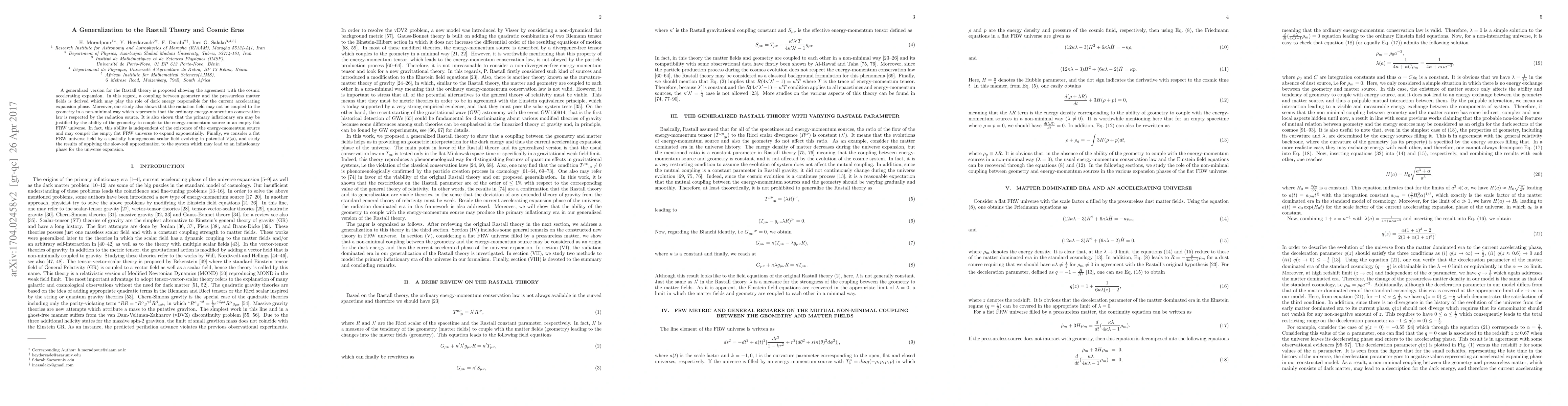 A generalized version for the Rastall theory is proposed showing the agreement with the cosmic accelerating expansion. In this regard, a coupling between geometry and the pressureless matter fields is derived which may play the role of dark energy responsible for the current accelerating expansion phase. Moreover, our study also shows that the radiation field may not be coupled to the geometry in a non-minimal way which represents that the ordinary energy-momentum conservation law is respected by the radiation source. It is also shown that the primary inflationary era may be justified by the ability of the geometry to couple to the energy-momentum source in an empty flat FRW universe. In fact, this ability is independent of the existence of the energy-momentum source and may compel the empty flat FRW universe to expand exponentially. Finally, we consider a flat FRW universe field by a spatially homogeneous scalar field evolving in potential $\mathcal{V}(\phi)$, and study the results of applying the slow-roll approximation to the system which may lead to an inflationary phase for the universe expansion.
