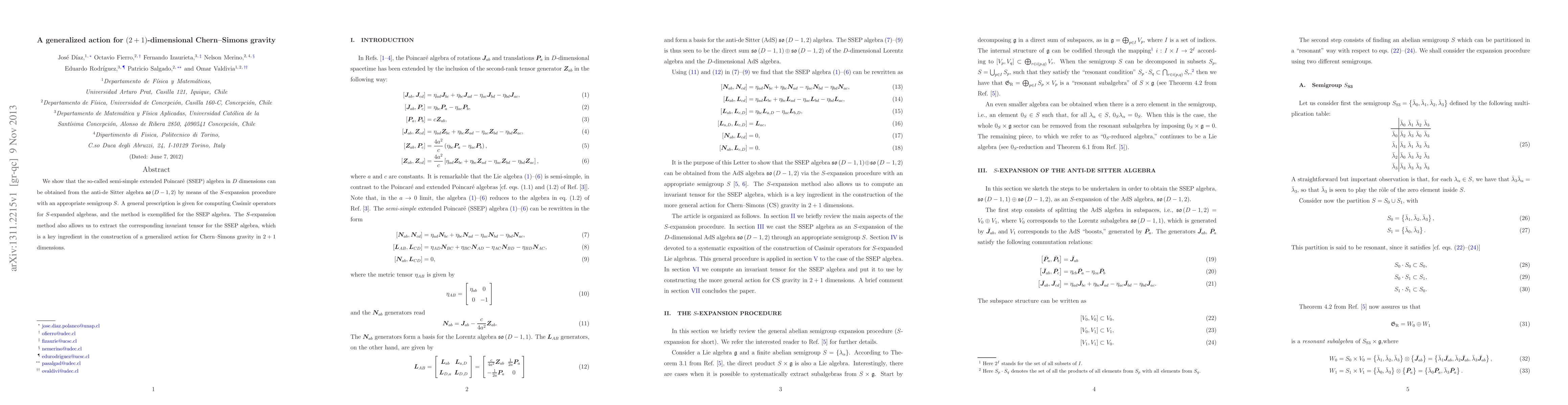 We show that the so-called semi-simple extended Poincar\'{e} (SSEP) algebra in $D$ dimensions can be obtained from the anti-de~Sitter algebra $\mathfrak{so} \left( D-1,2 \right)$ by means of the $S$-expansion procedure with an appropriate semigroup $S$. A general prescription is given for computing Casimir operators for $S$-expanded algebras, and the method is exemplified for the SSEP algebra. The $S$-expansion method also allows us to extract the corresponding invariant tensor for the SSEP algebra, which is a key ingredient in the construction of a generalized action for Chern--Simons gravity in $2+1$ dimensions.
