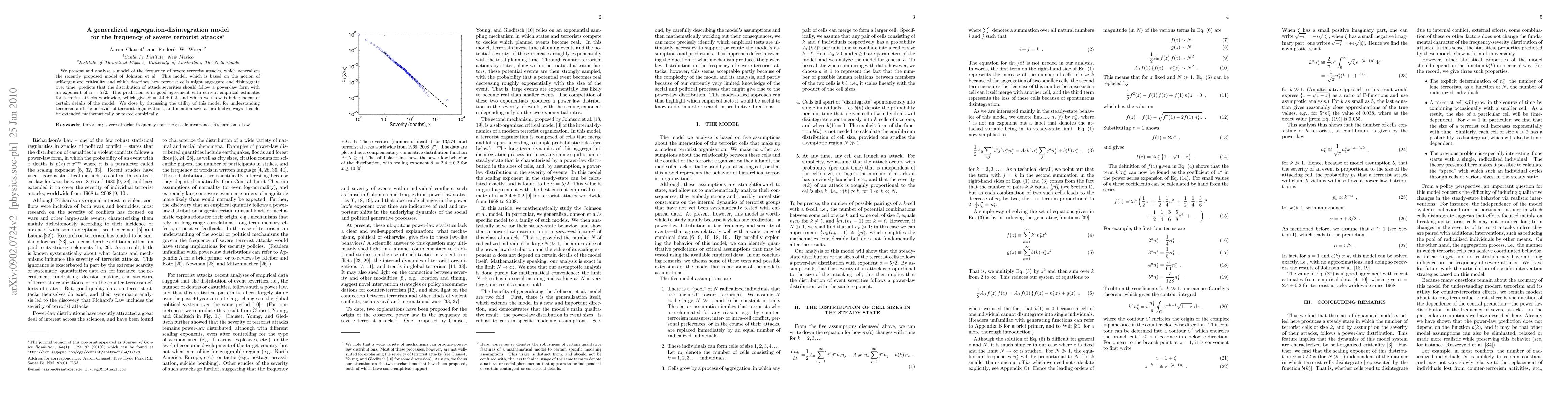 We present and analyze a model of the frequency of severe terrorist attacks, which generalizes the recently proposed model of Johnson et al. This model, which is based on the notion of self-organized criticality and which describes how terrorist cells might aggregate and disintegrate over time, predicts that the distribution of attack severities should follow a power-law form with an exponent of alpha=5/2. This prediction is in good agreement with current empirical estimates for terrorist attacks worldwide, which give alpha=2.4 \pm 0.2, and which we show is independent of certain details of the model. We close by discussing the utility of this model for understanding terrorism and the behavior of terrorist organizations, and mention several productive ways it could be extended mathematically or tested empirically.