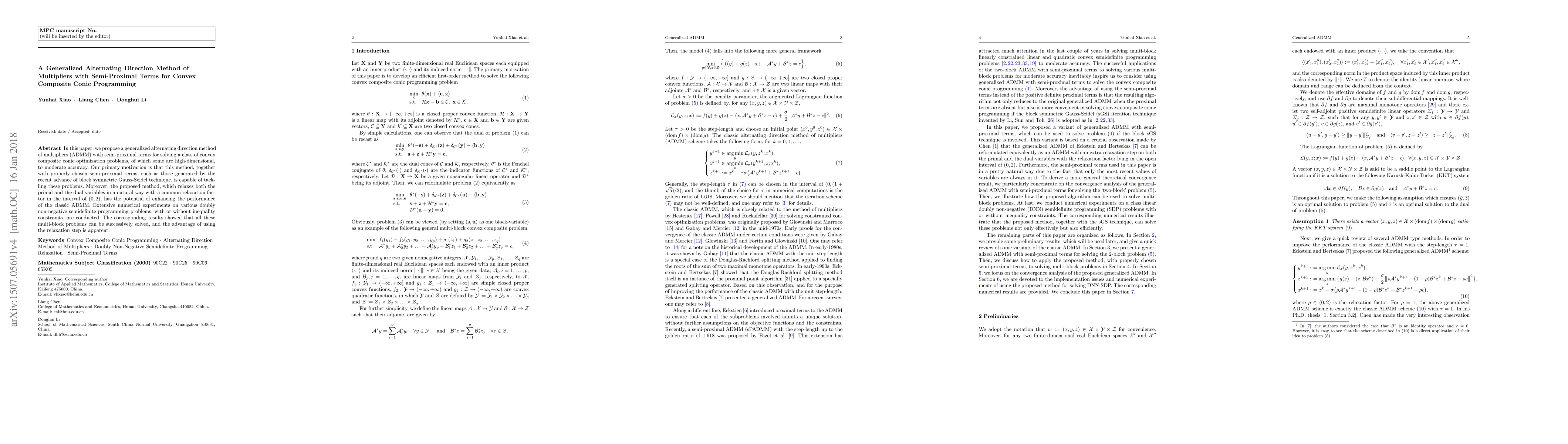 This paper introduces a generalized ADMM with semi-proximal terms for solving high-dimensional convex composite conic optimization problems. The proposed method enhances classic ADMM performance through relaxation factors and demonstrates effectiveness in numerical experiments on doubly non-negative semidefinite programming problems.