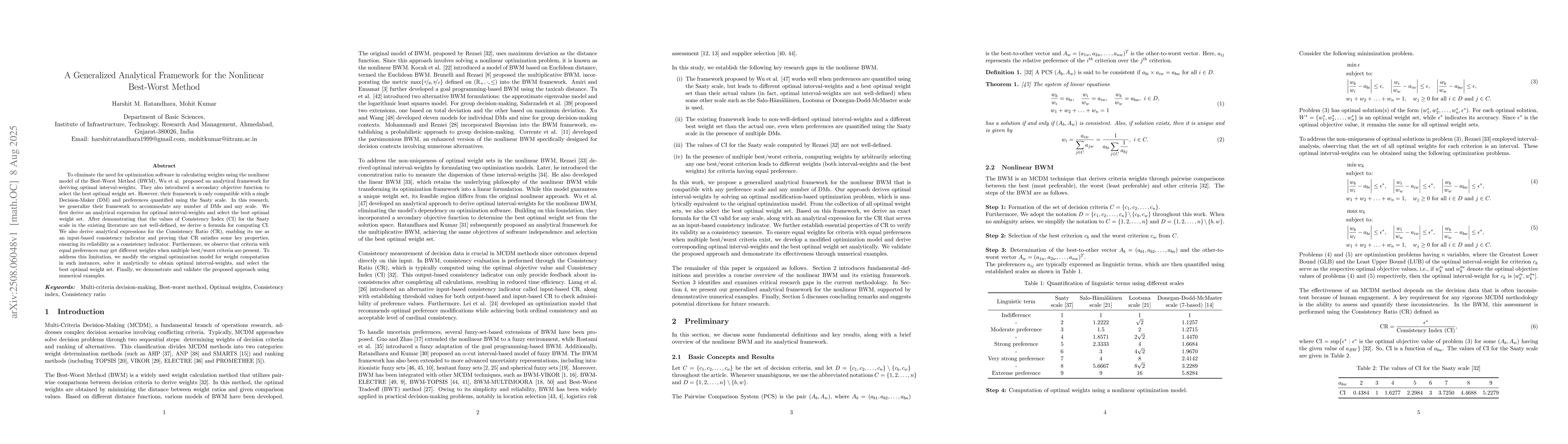 To eliminate the need for optimization software in calculating weights using the nonlinear model of the Best-Worst Method (BWM), Wu et al. proposed an analytical framework for deriving optimal interval-weights. They also introduced a secondary objective function to select the best optimal weight set. However, their framework is only compatible with a single Decision-Maker (DM) and preferences quantified using the Saaty scale. In this research, we generalize their framework to accommodate any number of DMs and any scale. We first derive an analytical expression for optimal interval-weights and select the best optimal weight set. After demonstrating that the values of Consistency Index (CI) for the Saaty scale in the existing literature are not well-defined, we derive n formula for computing CI. We also derive analytical expressions for the Consistency Ratio (CR), enabling its use as an input-based consistency indicator and proving that CR satisfies some key properties, ensuring its reliability as a consistency indicator. Furthermore, we observe that criteria with equal preferences may get different weights when multiple best/worst criteria are present. To address this limitation, we modify the original optimization model for weight computation in such instances, solve it analytically to obtain optimal interval-weights, and select the best optimal weight set. Finally, we demonstrate and validate the proposed approach using numerical examples.