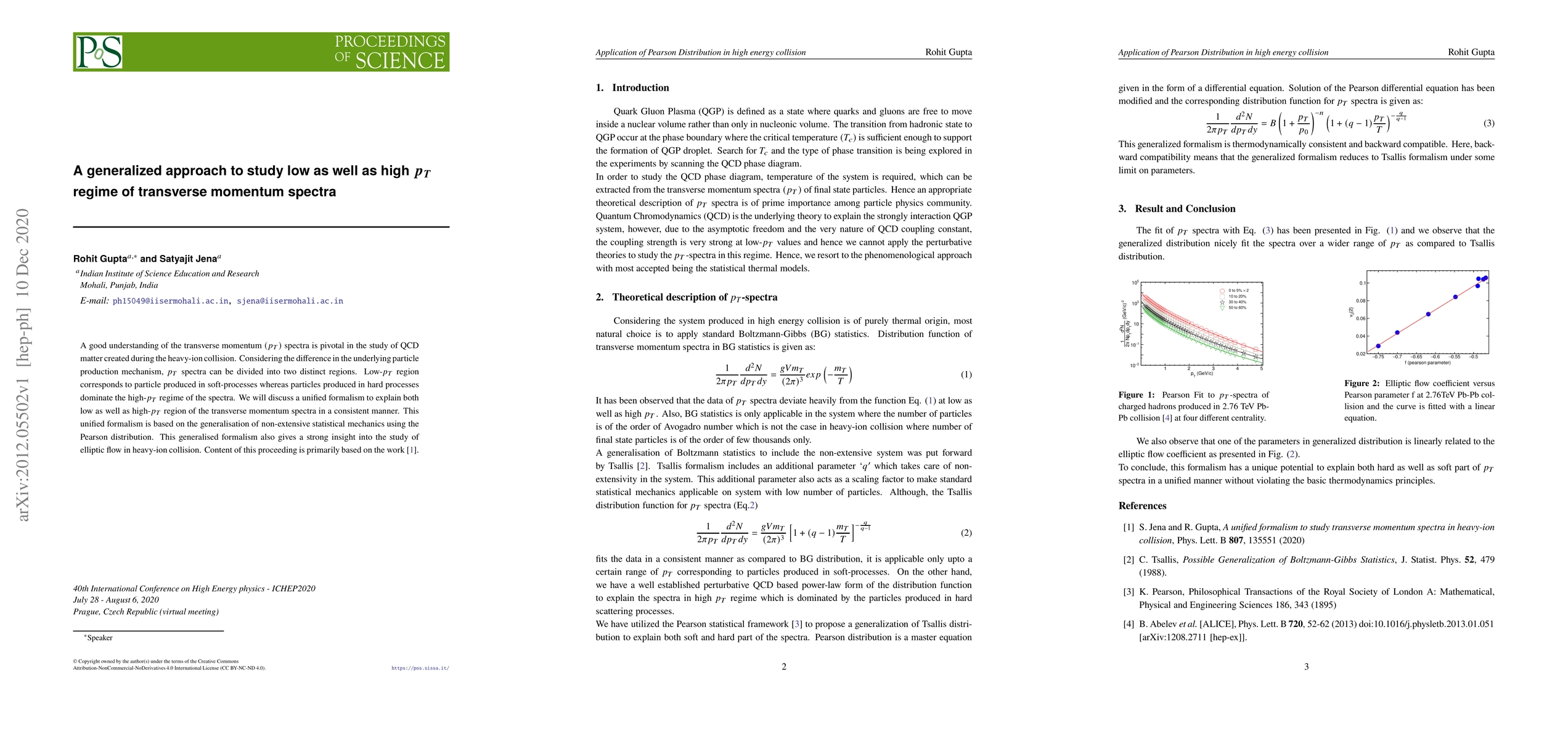 A good understanding of the transverse momentum $(p_T)$ spectra is pivotal in the study of QCD matter created during the heavy-ion collision. Considering the difference in the underlying particle production mechanism, $p_T$ spectra can be divided into two distinct regions. Low-$p_T$ region corresponds to particle produced in soft-processes whereas particles produced in hard processes dominate the high-$p_T$ regime of the spectra. We will discuss a unified formalism to explain both low as well as high-$p_T$ region of the transverse momentum spectra in a consistent manner. This unified formalism is based on the generalisation of non-extensive statistical mechanics using the Pearson distribution. This generalised formalism also gives a strong insight into the study of elliptic flow in heavy-ion collision.