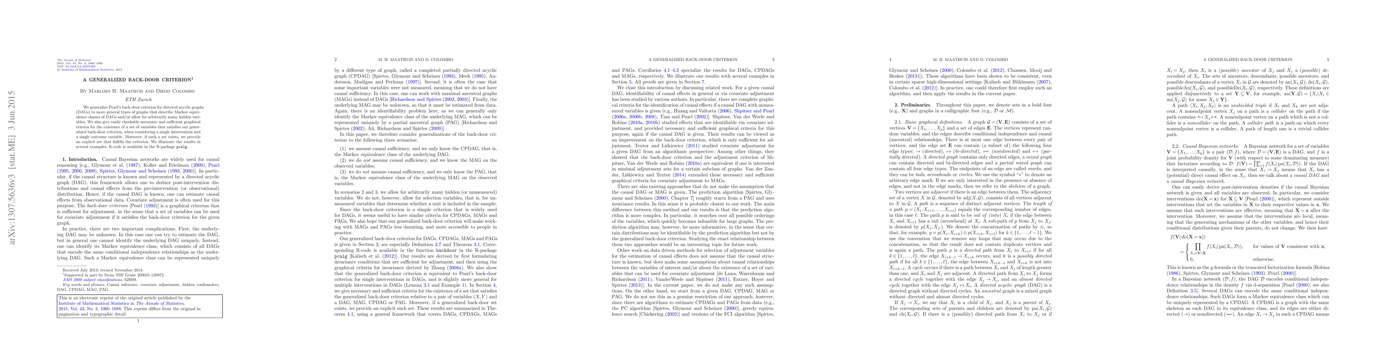 This paper generalizes Pearl's back-door criterion for identifying variables that control for confounding in directed acyclic graphs (DAGs) to more complex graph types. It provides necessary and sufficient graphical criteria for finding a set of variables that satisfy the generalized criterion under interventions and offers an explicit set fulfilling the criterion, illustrated with examples and supported by R-package pcalg.