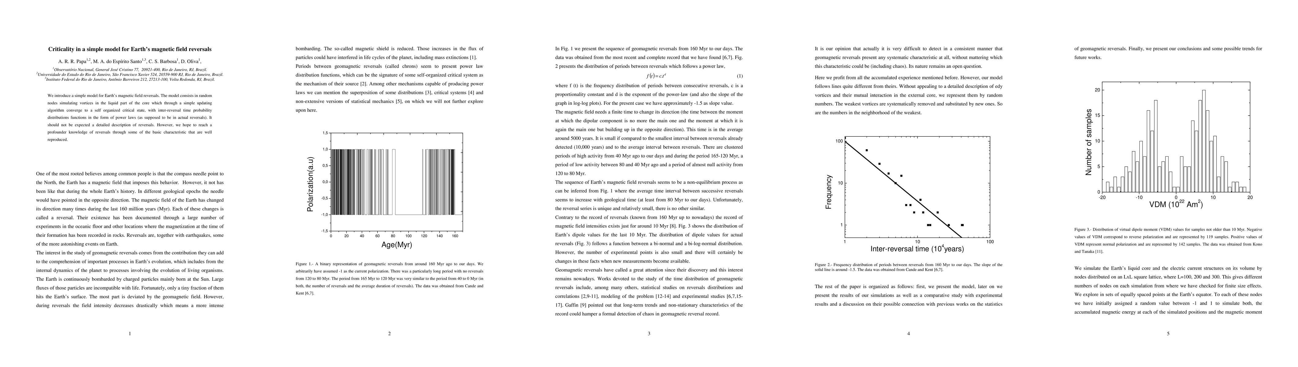 We introduce a simple model for Earth's magnetic field reversals. The model consists in random nodes simulating vortices in the liquid part of the core which through a simple updating algorithm converge to a self organized critical state, with inter-reversal time probability distributions functions in the form of power laws (as supposed to be in actual reversals). It should not be expected a detailed description of reversals. However, we hope to reach a profounder knowledge of reversals through some of the basic characteristic that are well reproduced.