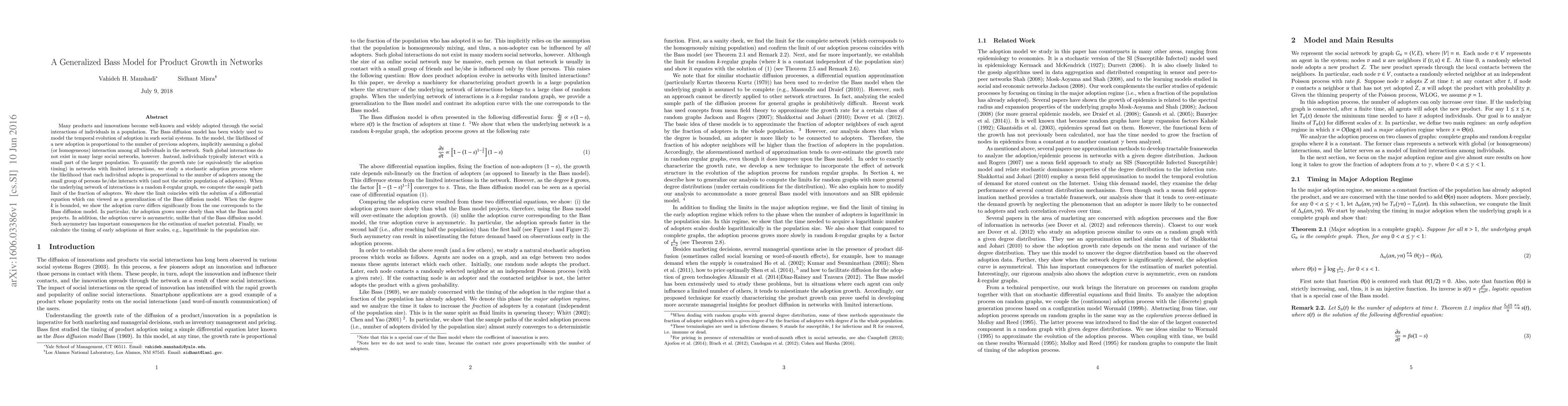 This paper generalizes the Bass diffusion model to account for adoption processes in networks where individuals interact locally rather than globally. It shows that in $k$-regular graphs, adoption growth is slower and asymmetric compared to the Bass model, impacting market potential estimation and early adoption timing.