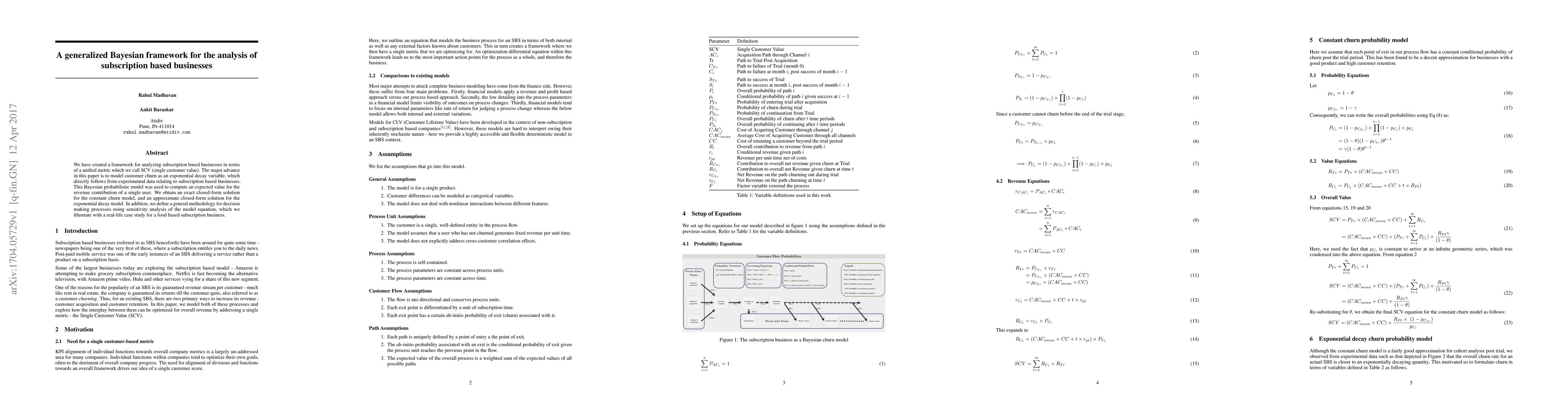 Researchers developed a Bayesian framework to analyze subscription-based businesses, providing a unified metric for single customer value and methods for decision-making using sensitivity analysis. The framework models customer churn as an exponential decay variable, offering exact and approximate solutions for revenue contribution calculations.
