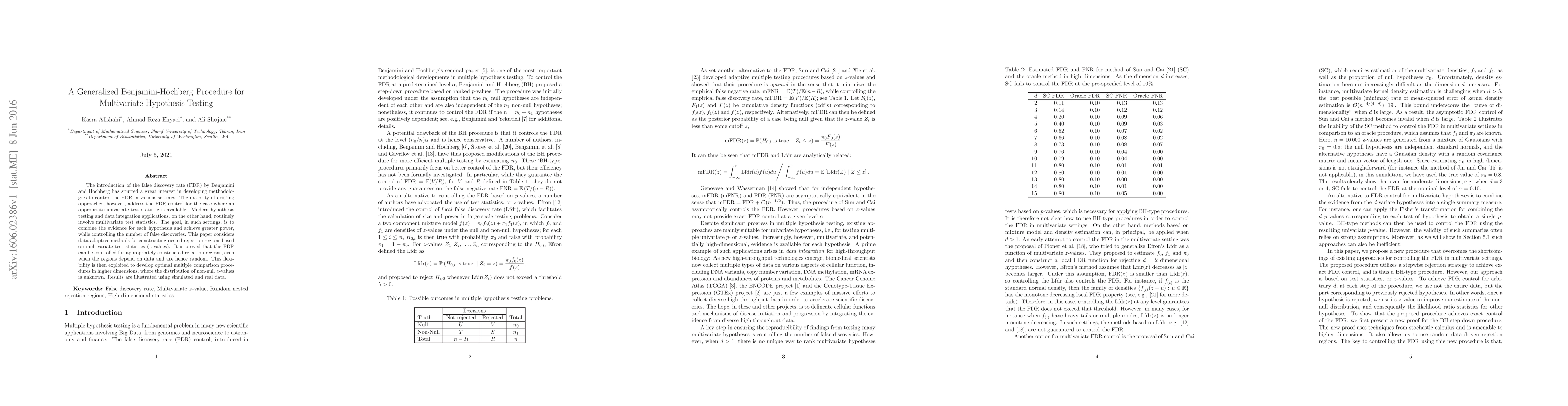 The introduction of the false discovery rate (FDR) by Benjamini and Hochberg has spurred a great interest in developing methodologies to control the FDR in various settings. The majority of existing approaches, however, address the FDR control for the case where an appropriate univariate test statistic is available. Modern hypothesis testing and data integration applications, on the other hand, routinely involve multivariate test statistics. The goal, in such settings, is to combine the evidence for each hypothesis and achieve greater power, while controlling the number of false discoveries. This paper considers data-adaptive methods for constructing nested rejection regions based on multivariate test statistics (z-values). It is proved that the FDR can be controlled for appropriately constructed rejection regions, even when the regions depend on data and are hence random. This flexibility is then exploited to develop optimal multiple comparison procedures in higher dimensions, where the distribution of non-null z-values is unknown. Results are illustrated using simulated and real data.
