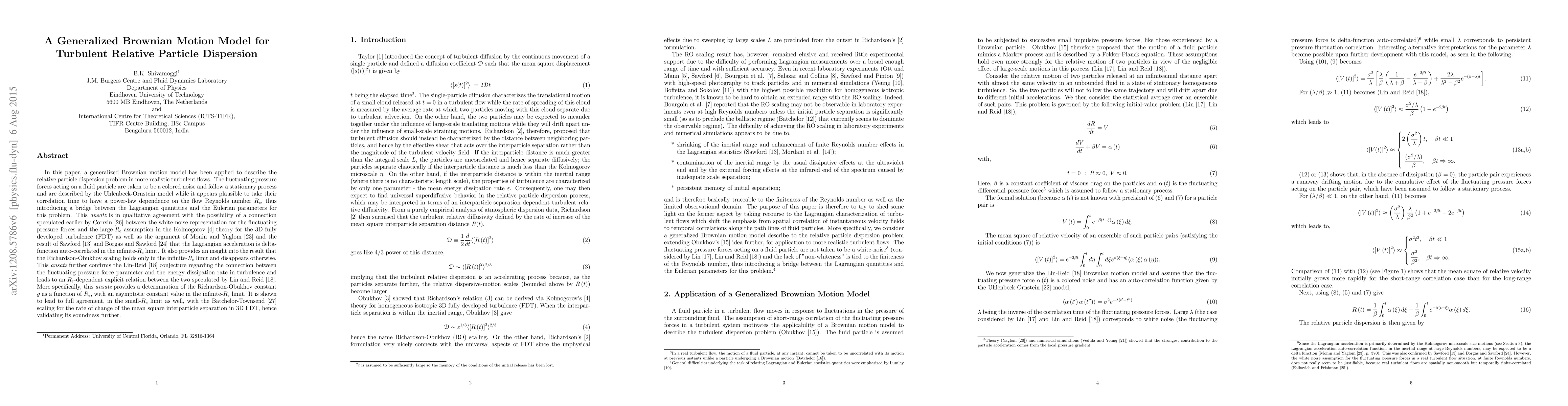 In this paper, a generalized Brownian motion model has been applied to describe the relative particle dispersion problem in more realistic turbulent flows. The fluctuating pressure forces acting on a fluid particle are taken to be a colored noise and follow a stationary process and are described by the Uhlenbeck-Ornstein model while it appears plausible to take their correlation time to have a power-law dependence on the flow Reynolds number $R_e$, thus introducing a bridge between the Lagrangian quantities and the Eulerian parameters for this problem. This ansatz is in qualitative agreement with the possibility of a connection speculated earlier by Corrsin [26] between the white-noise representation for the fluctuating pressure forces and the large-$R_e$ assumption in the Kolmogorov [4] theory for the 3D fully developed turbulence (FDT) as well as the argument of Monin and Yaglom [23] and the result of Sawford [13] and Borgas and Sawford [24] that the Lagrangian acceleration is delta-function auto-correlated in the infinite-$R_e$ limit. It also provides an insight into the result that the Richardson-Obukhov scaling holds only in the infinite-$R_e$ limit and disappears otherwise. This ansatz further confirms the Lin-Reid [18] conjecture regarding the connection between the fluctuating pressure-force parameter and the energy dissipation rate in turbulence and leads to an $R_e$-dependent explicit relation between the two speculated by Lin and Reid [18]. More specifically, this ansatz provides a determination of the Richardson-Obukhov constant $g$ as a function of $R_e$, with an asymptotic constant value in the infinite-$R_e$ limit. It is shown to lead to full agreement, in the small-$R_e$ limit as well, with the Batchelor-Townsend [27] scaling for the rate of change of the mean square interparticle separation in 3D FDT, hence validating its soundness further.