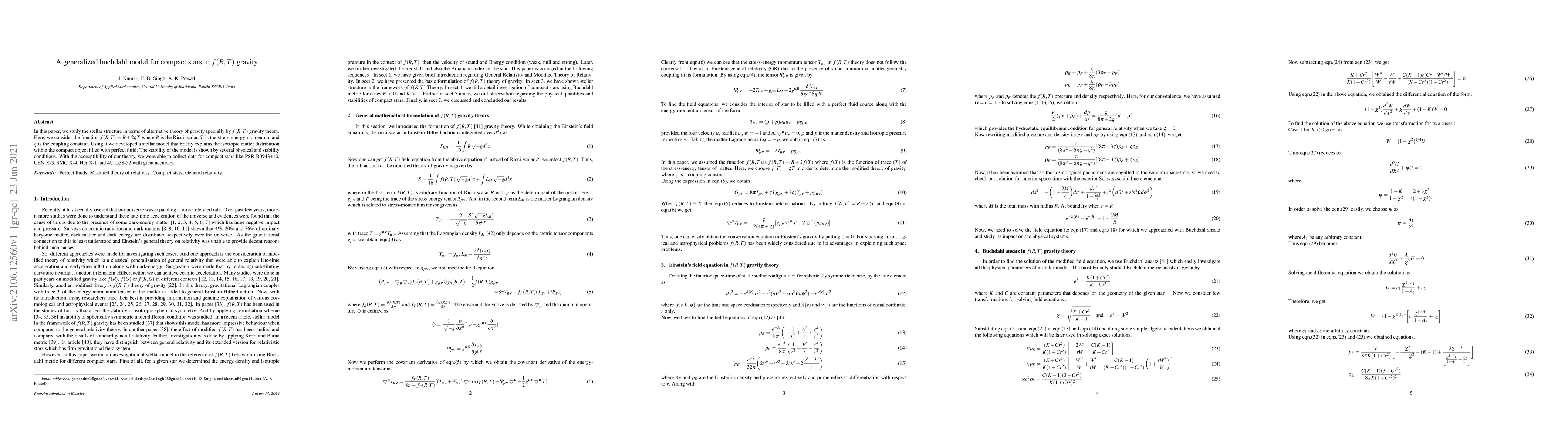 This paper develops a generalized Buchdahl model for compact stars using the f(R;T) gravity theory, where f(R;T) = R+2VT. The model describes an isotropic matter distribution within perfect fluid compact objects and demonstrates its stability through various physical conditions, successfully fitting observational data for several compact stars.