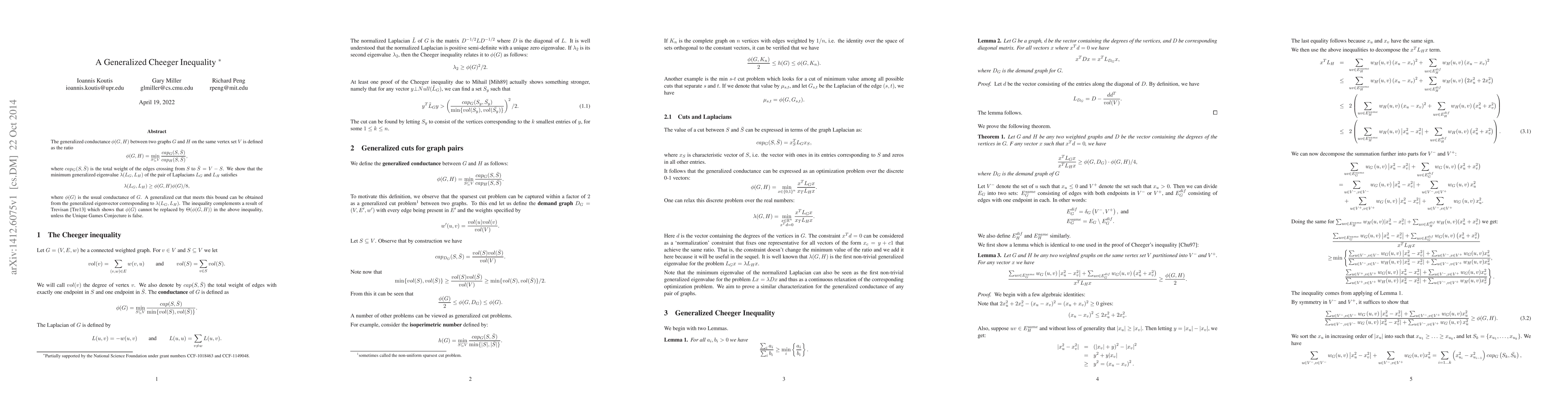 The generalized conductance $\phi(G,H)$ between two graphs $G$ and $H$ on the same vertex set $V$ is defined as the ratio $$ \phi(G,H) = \min_{S\subseteq V} \frac{cap_G(S,\bar{S})}{ cap_H(S,\bar{S})}, $$ where $cap_G(S,\bar{S})$ is the total weight of the edges crossing from $S$ to $\bar{S}=V-S$. We show that the minimum generalized eigenvalue $\lambda(L_G,L_H)$ of the pair of Laplacians $L_G$ and $L_H$ satisfies $$ \lambda(L_G,L_H) \geq \phi(G,H) \phi(G)/8, $$ where $\phi(G)$ is the usual conductance of $G$. A generalized cut that meets this bound can be obtained from the generalized eigenvector corresponding to $\lambda(L_G,L_H)$. The inequality complements a recent proof that $\phi(G)$ cannot be replaced by $\Theta(\phi(G,H))$ in the above inequality, unless the Unique Games Conjecture is false.