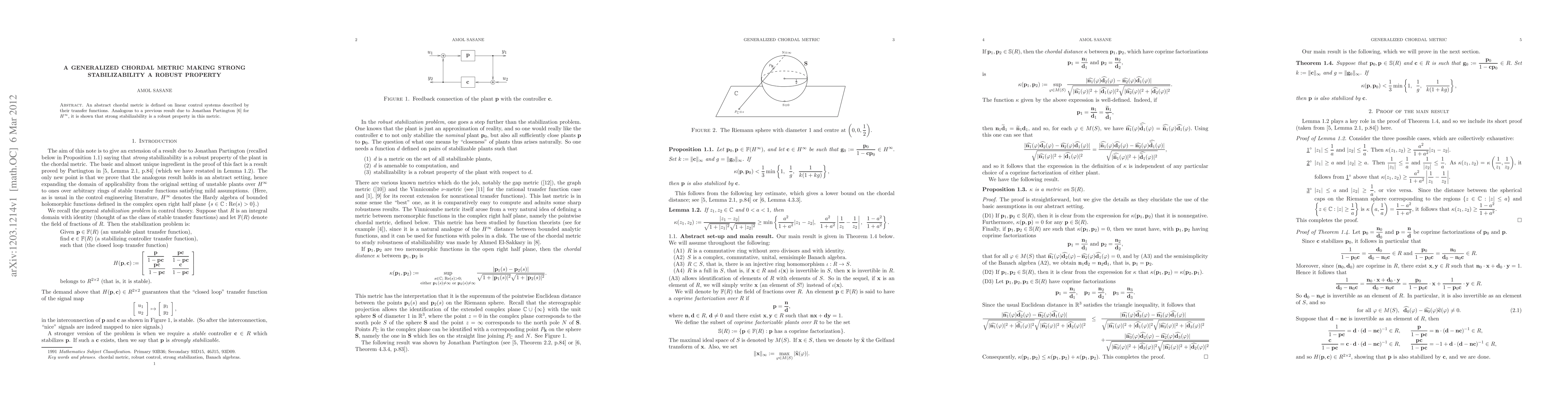 An abstract chordal metric is defined on linear control systems described by their transfer functions. Analogous to a previous result due to Jonathan Partington ("Robust control and approximation in the chordal metric", in Robust Control, LNCIS 183, Springer, 1992) for H^infty, it is shown that strong stabilizability is a robust property in this metric.