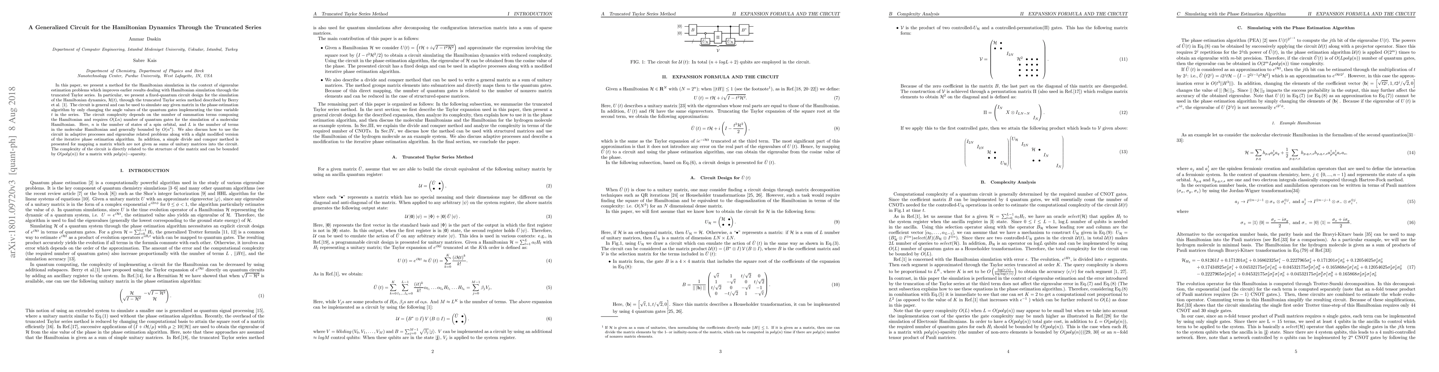 This paper introduces a generalized quantum circuit for Hamiltonian simulation using a truncated Taylor series, improving upon previous methods. The proposed circuit can simulate any matrix in phase estimation by adjusting gate angles, with complexity dependent on the Hamiltonian's terms and bounded by $O(Ln)$ quantum gates.