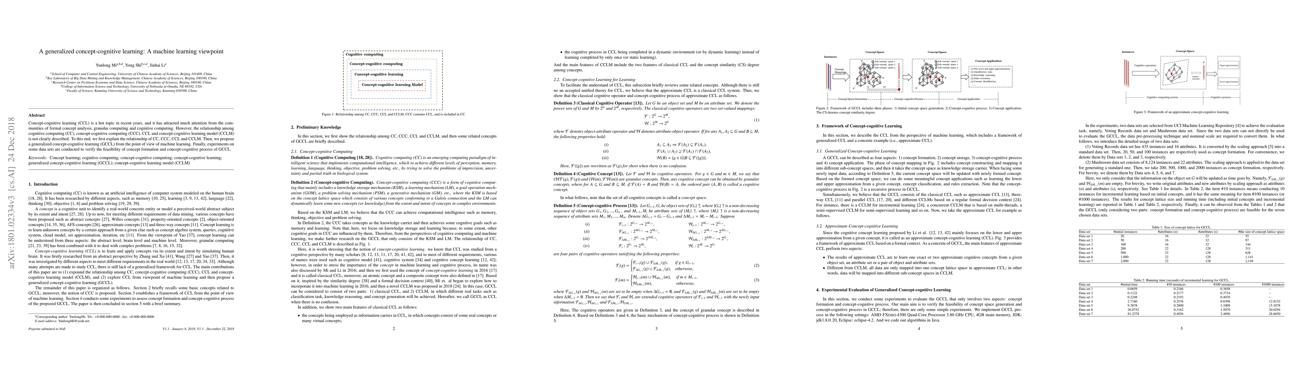 Concept-cognitive learning (CCL) is a hot topic in recent years, and it has attracted much attention from the communities of formal concept analysis, granular computing and cognitive computing. However, the relationship among cognitive computing (CC), concept-cognitive computing (CCC), CCL and concept-cognitive learning model (CCLM) is not clearly described. To this end, we first explain the relationship of CC, CCC, CCL and CCLM. Then, we propose a generalized concept-cognitive learning (GCCL) from the point of view of machine learning. Finally, experiments on some data sets are conducted to verify the feasibility of concept formation and concept-cognitive process of GCCL.