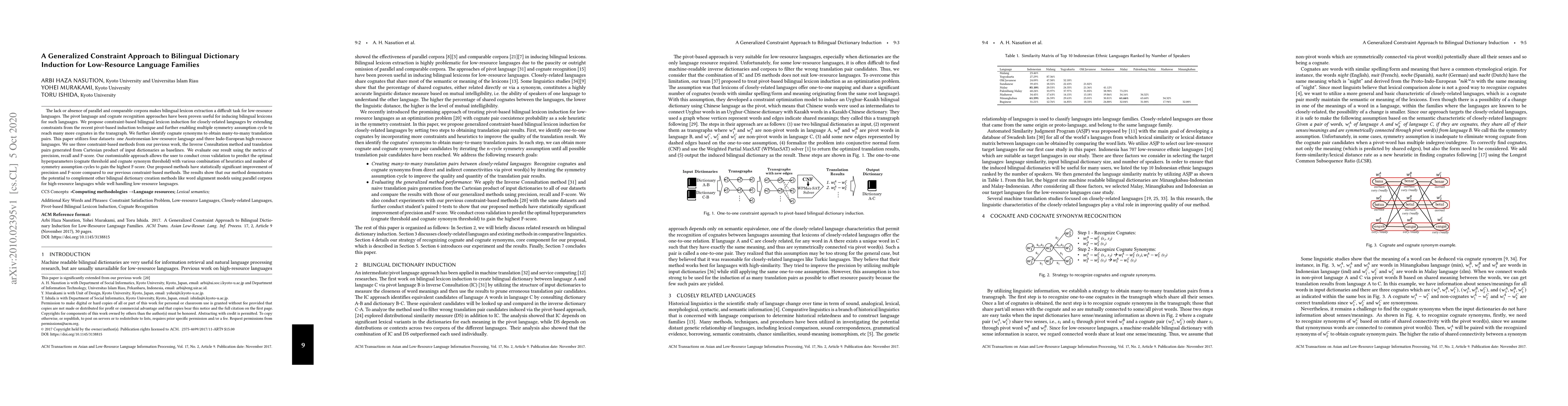 This paper proposes a generalized constraint approach for inducing bilingual lexicons for low-resource languages by leveraging pivot-based induction and multiple symmetry assumption cycles. The method shows statistically significant improvements in precision and F-score compared to previous constraint-based methods, demonstrating its effectiveness for low-resource language families.