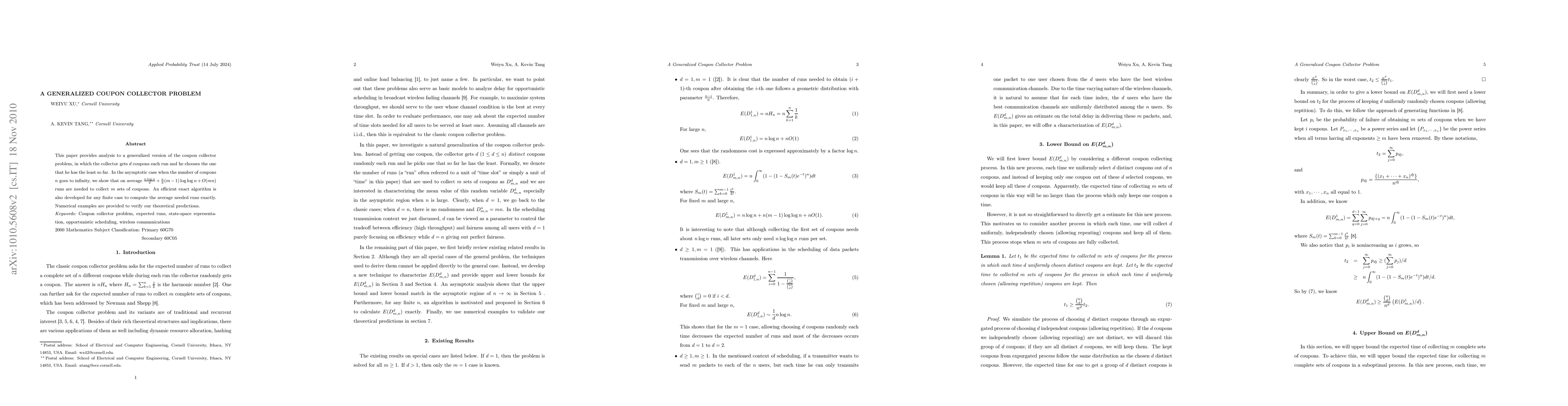 This paper generalizes the coupon collector problem where a collector gathers $d$ distinct coupons per run, selecting the least-owned one. It shows that asymptotically, $\frac{n\log n}{d} + \frac{n}{d}(m-1)\log\log{n} + O(mn)$ runs are needed to collect $m$ sets of coupons, and provides an exact algorithm for finite cases.