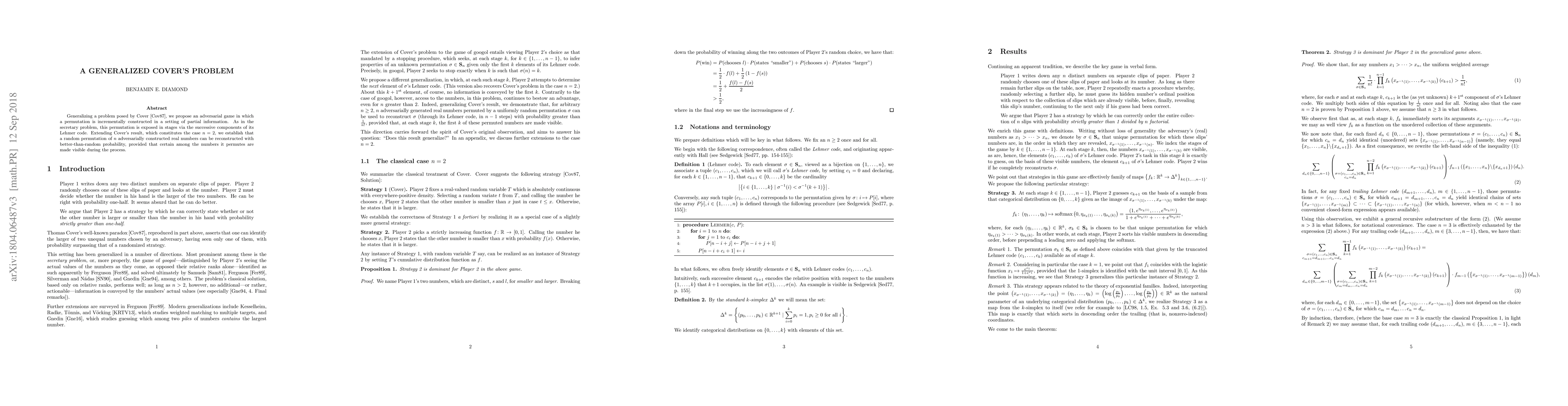 Generalizing a problem posed by Cover, we propose an adversarial game in which a permutation is incrementally constructed in a setting of partial information. As in the secretary problem, this permutation is exposed in stages via the successive components of its Lehmer code. Extending Cover's result, which constitutes the case $n = 2$, we establish that a random permutation of $n$ adversarially constructed real numbers can be reconstructed with better-than-random probability, provided that certain among the numbers it permutes are made visible during the process.